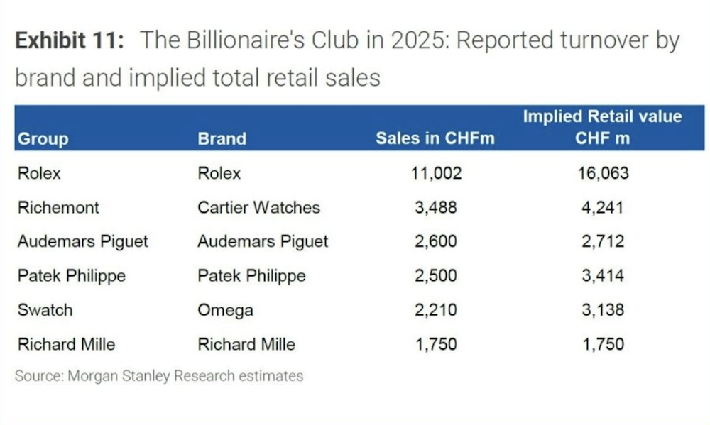 摩根士丹利對2025年前50大瑞士鐘錶品牌營業額以及零售或批發價值的估算。