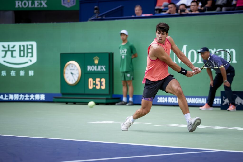 勞力士代言人艾卡拉斯在2024年勞力士上海大師賽中的一記反手擊球。