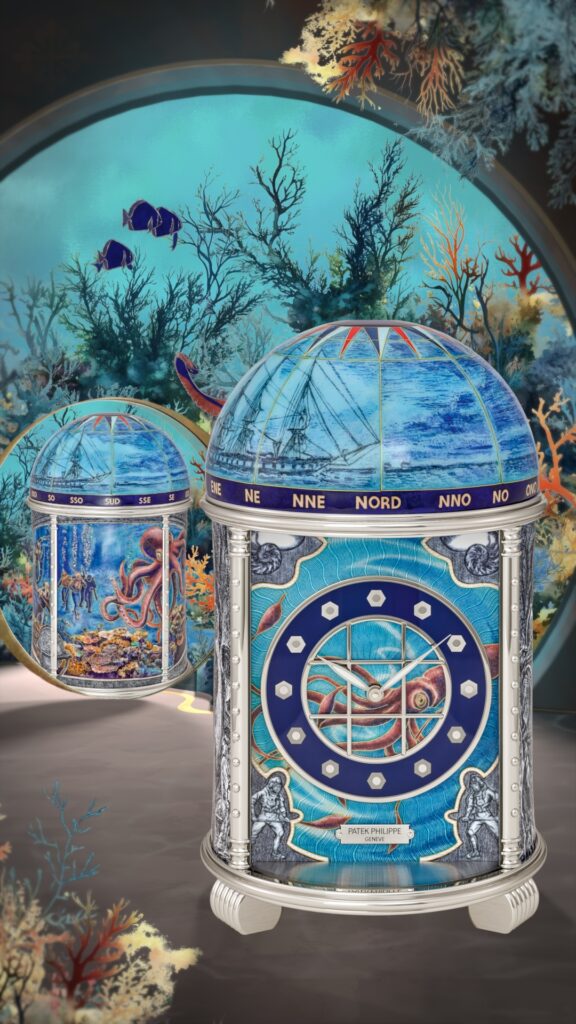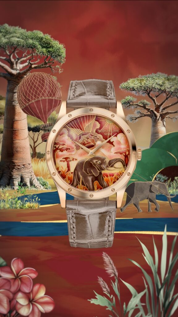 歷史上舉足輕重的大文豪Jules Verne,堪稱文學精神的象徵。Ref. 20171M-001「鸚鵡螺號」拱頂枱鐘以掐絲琺瑯和灰色琺瑯利摩日白釉工藝裝飾,配合微繪琺瑯工藝加以點綴,構圖靈感源自歷險小說《海底兩萬里》。三款Calatrava掐絲琺瑯腕錶亦同時向這位法國作家致敬,呈現他筆下其他小說的場景。例如Ref. 5086R-001「汽球上的五星期」時計,展示大象拖動「維多利亞」號汽球的著名情節。