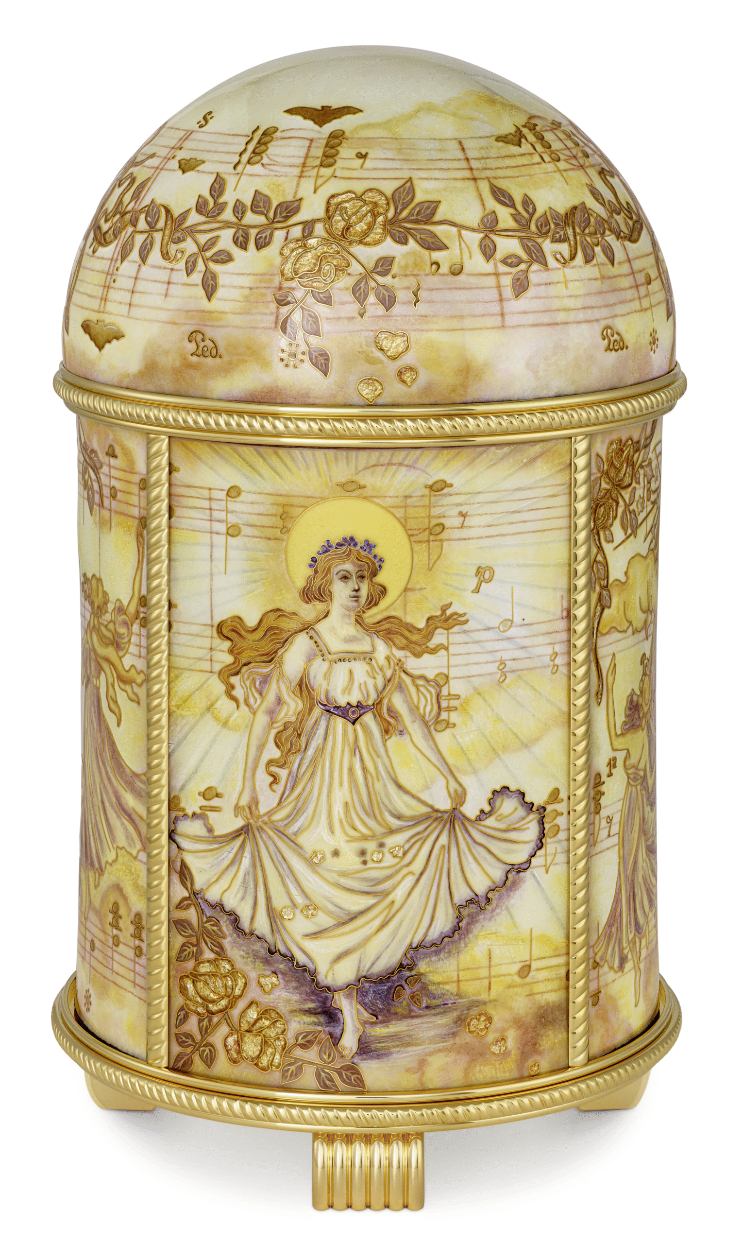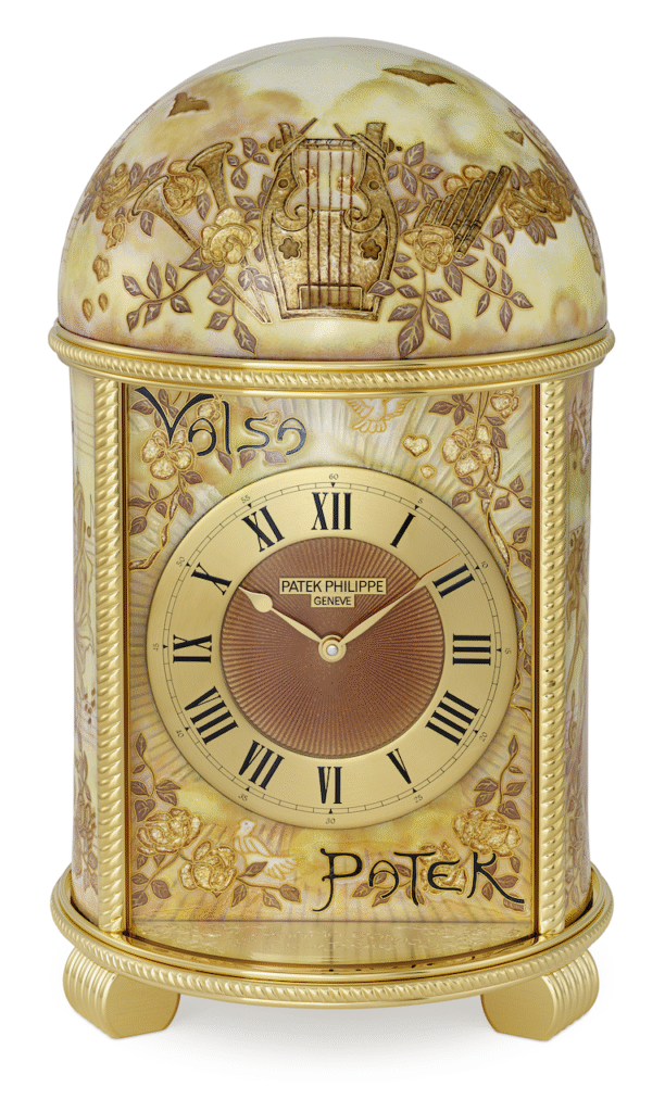 繼2024「昔日之日內瓦」系列之後,今年品牌推出三款Golden Ellipse腕錶,展現「英國往昔」,並以微繪琺瑯工藝,配以懷舊的棕啡色調,重新詮釋舊明信片上的景致。Golden Ellipse Ref. 5738/50G-033「鐘錶齒輪組」腕錶以製錶為主題,錶盤以掐絲琺瑯和灰色琺瑯利摩日白釉工藝裝飾,向他們的240超薄自動機芯致敬。Ref. 20187M-001「百達圓舞曲」拱頂枱鐘,則向品牌的文化傳統致意,掐絲琺瑯與金片鑲嵌琺瑯鐘身展現了人手雕刻的細節,設計靈感源自1970年一份樂譜,那首樂曲專為品牌的巴西零售商Gondolo & Labouriau 創作而成。