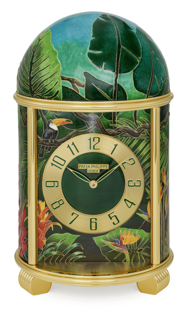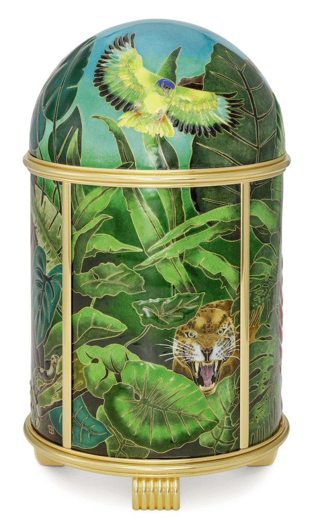 至於拱頂枱鐘,代表作就有獨一無二的Ref. 20188M-001「亞馬遜雨林」,枱鐘以大明火掐絲琺瑯工藝打造,工匠以長約17.46米、重約32.24克的金線,勾勒出葉片和動物的輪廓,再以59種琺瑯顏色,為畫作填上鮮艷的色彩,每塊琺瑯飾板需以攝氏890至910度燒製10至14次。小時時標環印有綠色阿拉伯數字時標,搭配中間漆上綠色的葉形指針,錶盤中央再添上一層綠色半透明琺瑯。枱鐘搭載17’’’ PEND機械機芯,並以電動馬達上鍊。