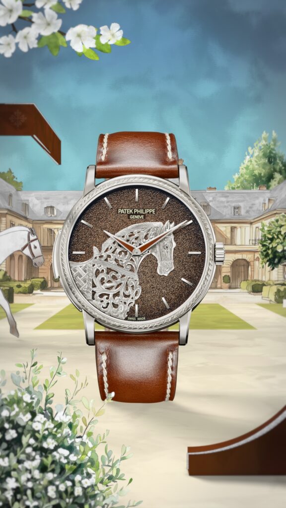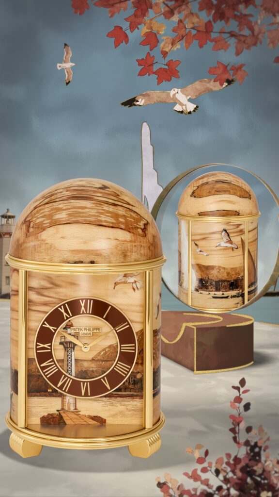 Ref. 20191M-001「昔日滑雪風情」掐絲琺瑯拱頂枱鐘,重現了阿爾卑斯山旅遊業與瑞士平面設計的景象。畫像以微繪琺瑯工藝潤飾,令細節更加精緻。Ref. 21000M-001「日內瓦港岸」,是首款以微型木鑲嵌工藝裝飾的拱頂枱鐘,結集了 2,191件微小飾板組件,涵蓋41種木材,顏色、質感和紋路各有不同。Ref. 5278/500G-001「馬匹」三問腕錶,以人手雕製白金鑲飾,飾件設計靈感源自印度的 「丘那爾馬」;錶圈和針扣由人手刻上類似馬匹辮狀鬃毛的圖案。