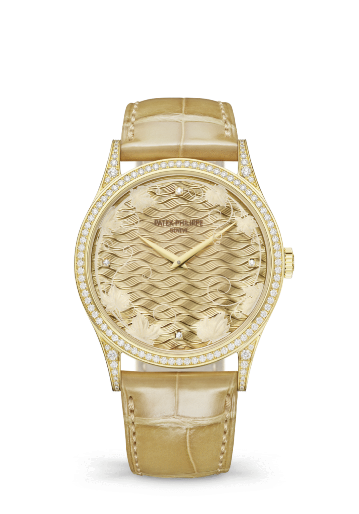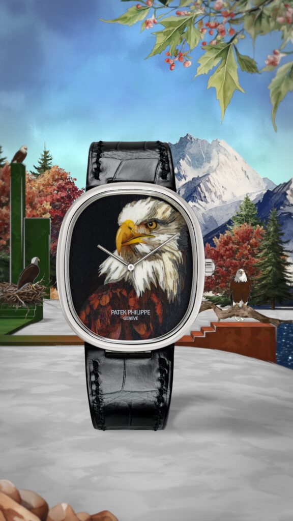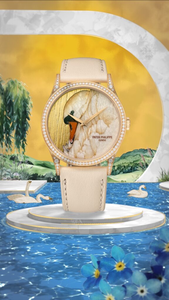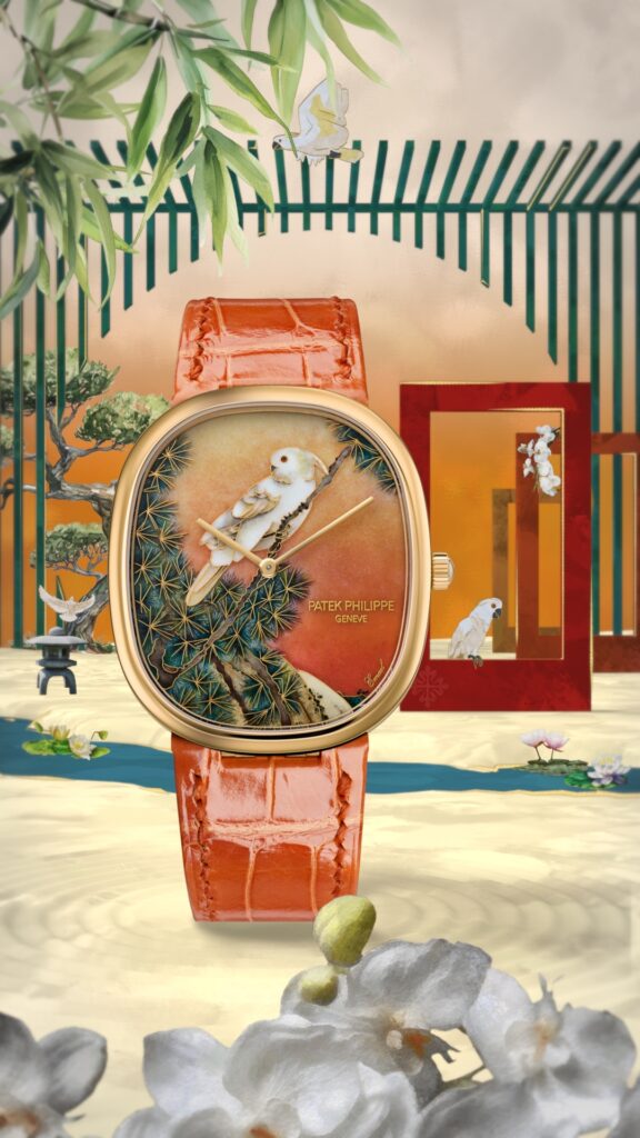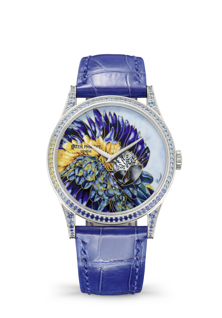 在面臨日內瓦湖景的展室中,Patek Philippe展出了所有向自然之美致意的時計作品,主題包括動物、植物和景致。當中的「鳥」再度成為今年展覽的重要主題之一,而Golden Ellipse Ref. 5738/50J-011「小葵花鳳頭鸚鵡」腕錶更是一大焦點,錶盤採用了掐絲琺瑯和微繪琺瑯兩種傳統工藝,黄金錶殼尺碼為34.5 x 39.5毫米,厚度6.5毫米;Calatrava Ref. 5077/100R-071「白天鵝」腕錶的錶盤則以微型木鑲嵌工藝打造,再以金箔潤飾,玫瑰金錶殼直徑38毫米,錶圈和錶耳鑲有112顆共重約0.87克拉的圓鑽;Golden Ellipse Ref. 5738/50G-029「白頭鷹」腕錶的錶盤同樣以微型木鑲嵌工藝打造,白金錶殼尺碼也是34.5 x 39.5毫米;Calatrava Ref. 5077/212R-001「藍地上的金剛鸚鵡」腕錶的錶盤則採用了掐絲琺瑯和微繪琺瑯兩種傳統工藝,白金錶殼直徑38毫米,錶圈、錶耳和錶扣鑲有70顆共重約0.72克拉的藍色托帕石、50顆共重約0.63克拉的藍色藍寶石、11顆共重約0.13克拉的黄色藍寶石,以及10顆共重約0.02克拉的鑽石,襯皇家藍色鱷魚皮錶帶。以上四款腕錶均搭載Caliber 240超薄自動機芯,各限量10枚。