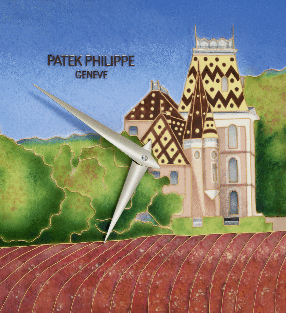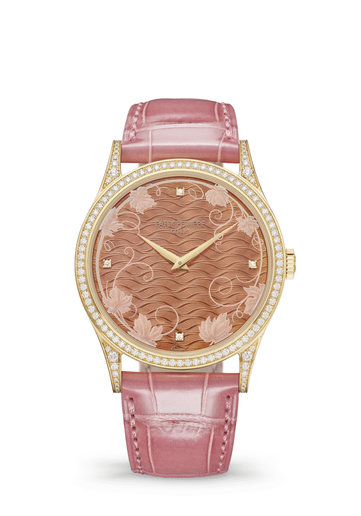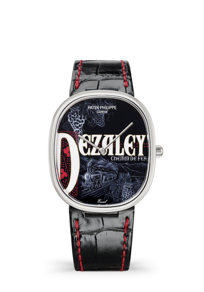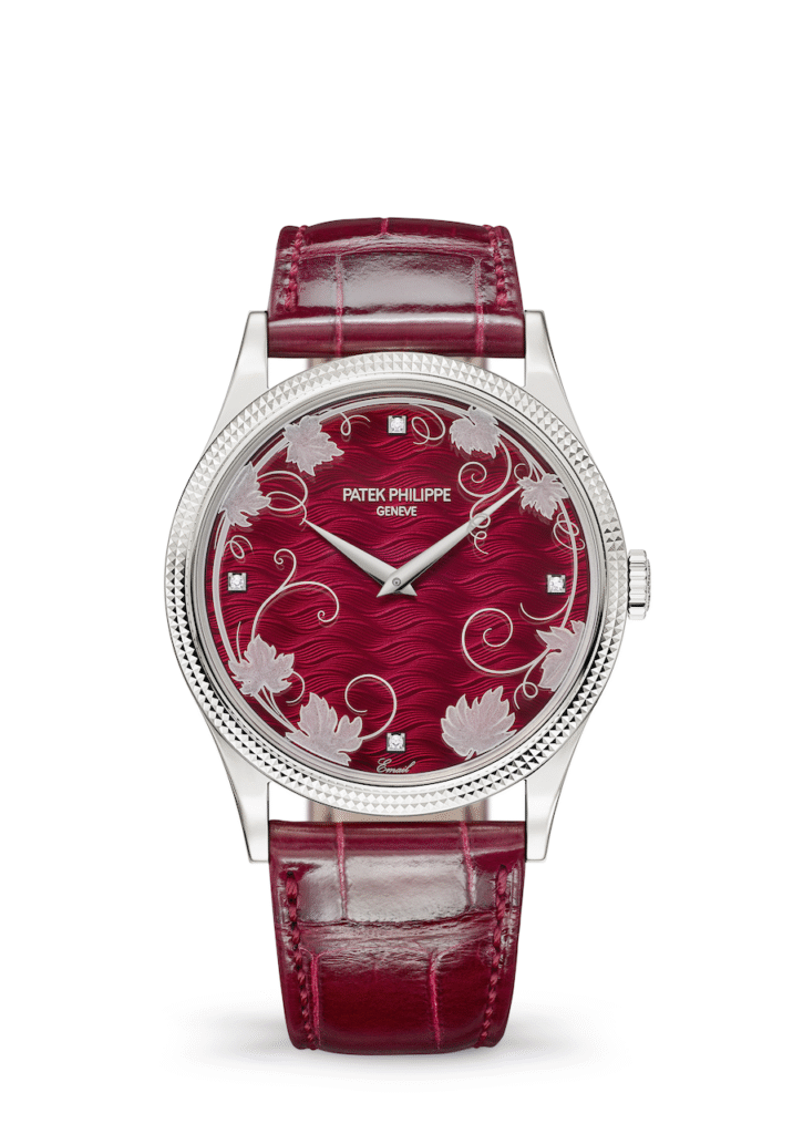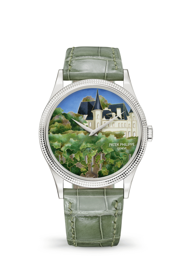 Calatrava Ref. 5077/100J-001、Ref. 5077/100R-066和Ref. 5177G-052「葡藤與佳釀」腕錶,彰顯白酒、粉紅酒和紅酒的色調與細膩變化,透明琺瑯錶盤搭配手工雕刻的藍寶石水晶,是品牌珍稀手工藝時計系列中一種新穎的裝飾工藝。Golden Ellipse Ref. 5738/50G-032「德扎利 Chemin de fer」腕錶,結合了掐絲琺瑯、微繪琺瑯與灰色琺瑯利摩日白釉工藝,創作靈感來自瑞士拉沃一個酒標。