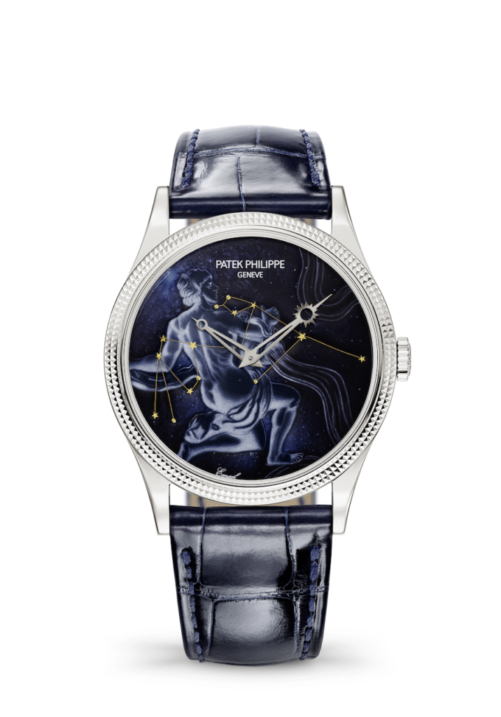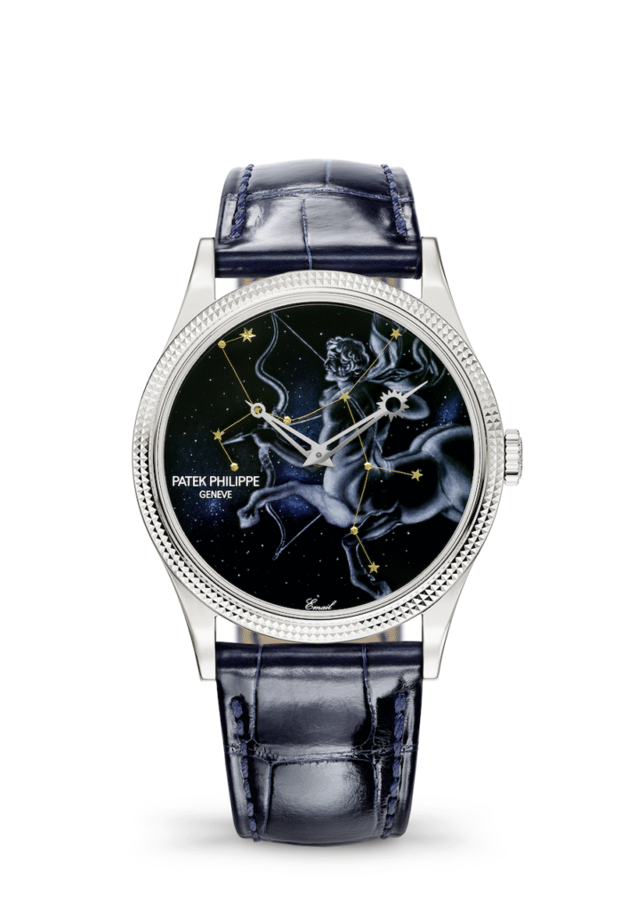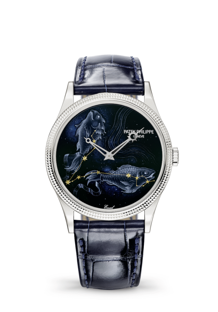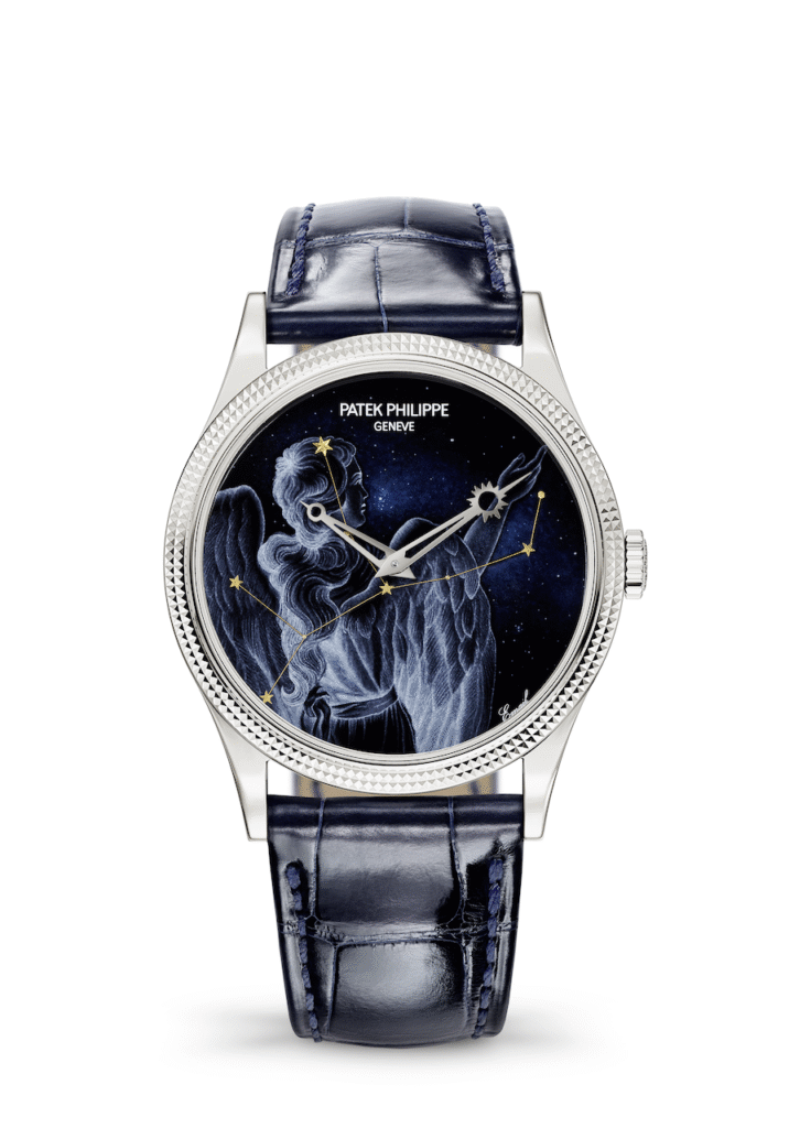 位於展區中央的是12款Calatrava腕錶組合,並按照地、火、風、水四大元素展示,每款均以灰色琺瑯利摩日白釉、大明火掐絲琺瑯或金片鑲嵌琺等工藝,裝飾與黄道十二宮相關星座的錶盤。12款腕錶各限量兩枚,地元素包括Ref. 5177G-039的金牛座、Ref. 5177G-043的處女座和Ref. 5177G-047的山羊座,火元素就有Ref. 5177G-038的白羊座、Ref. 5177G-042的獅子座和Ref. 5177G-046的人馬座,風元素是Ref. 5177G-040的雙子座、Ref. 5177G-044天秤座和Ref. 5177G-048的水瓶座,最後的水元素則有Ref. 5177G-041的巨蟹座、Ref. 5177G-045的天蠍座和Ref. 5177G-049的雙魚座。