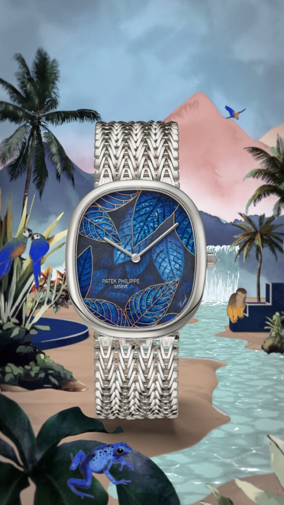 以植物為主題的有Golden Ellipse Ref. 5738 150G-001「藍葉及白金」腕錶,錶盤以大明火掐絲琺瑯、微繪琺瑯和銀箔鑲嵌琺瑯工藝裝飾。搭配品牌獨有的白金編織鏈帶。另備有「藍葉及玫瑰金」版本,各限量10枚。