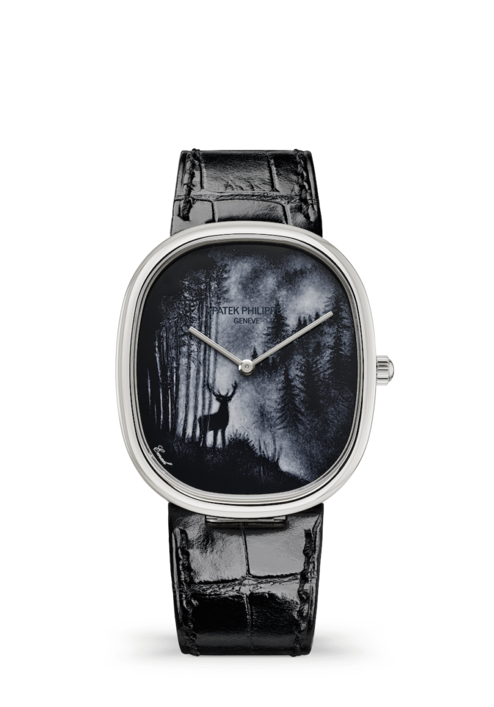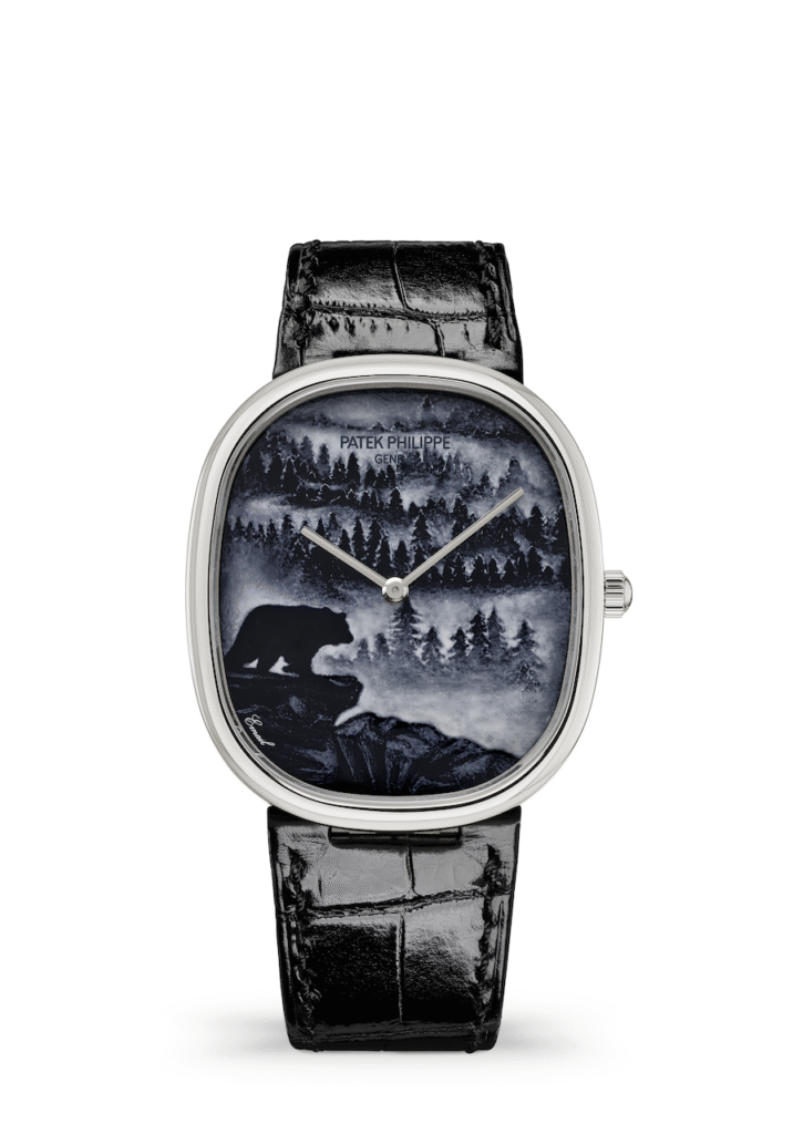 在景致方面,Golden Ellipse的兩款腕錶Ref. 5738/50G-030「霧中雄鹿」和Ref. 5738/50G-034「霧中熊影」,錶盤畫像均營造出森林的神秘氣氛,工匠以灰色琺瑯利摩日白釉工藝,在白色背景上呈現森林棲息的動物黑影輪廓,每塊錶盤均需以攝氏750至800度燒製11至12次。兩款腕錶錶殼均以白色打造,各限量10枚。