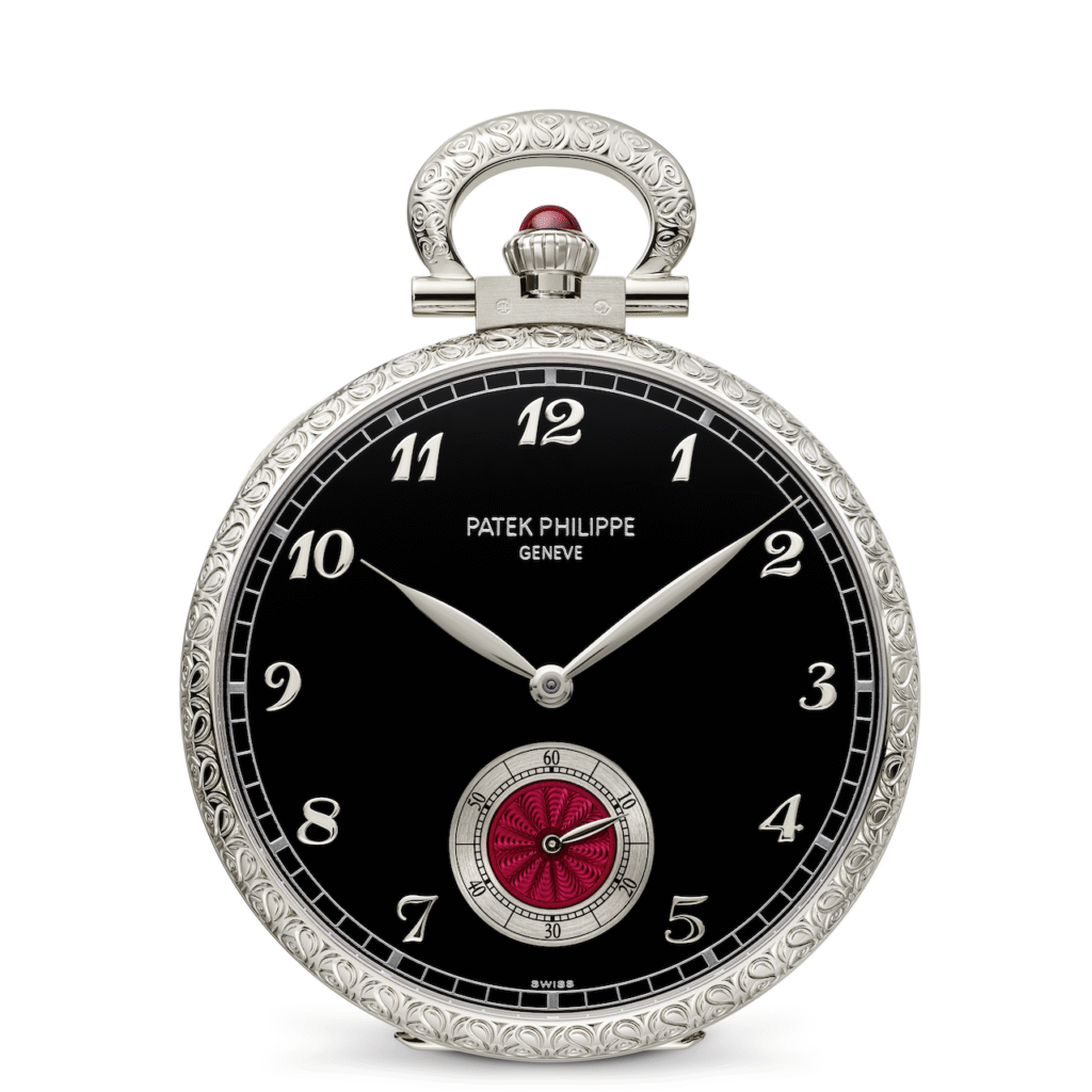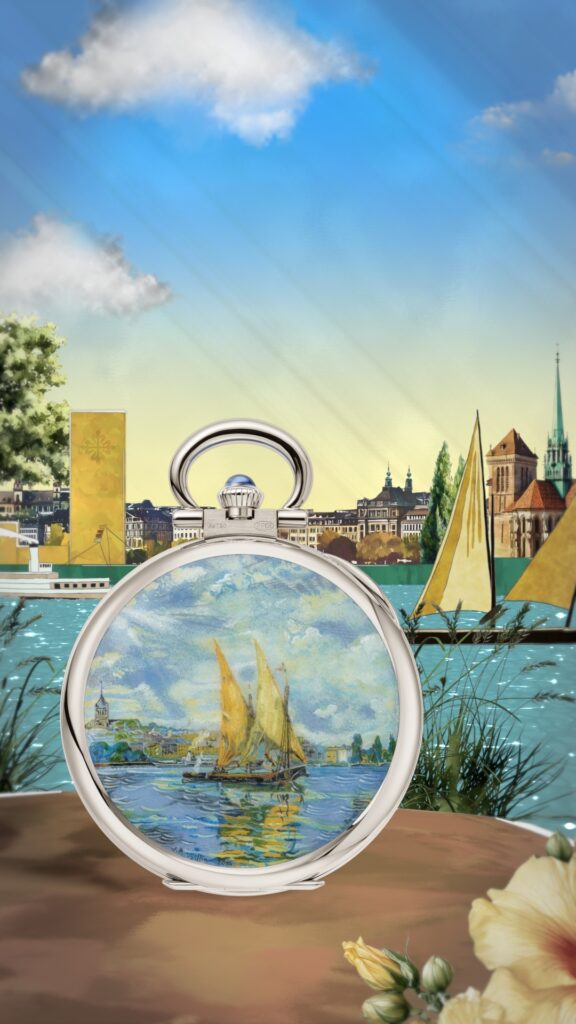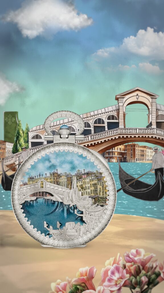 另有一組三枚微繪琺瑯袋錶,體現了在圓形時計有限空間內演繹傑出畫作的難度,以及百達翡麗在這一領域的超凡技藝。當中包括Ref. 992/187G-001袋錶,演繹了日內瓦畫家Louis Baudit(1870-1960)的作品《日內瓦湖三桅帆船》;Ref. 992/160G-001「里阿爾托橋」袋錶,演繹著名畫家Canaletto(1697-1768)的一幅油畫作品,透過人手線雕技巧,在錶殼底蓋邊緣、錶圈和扣環刻上花卉飾帶。