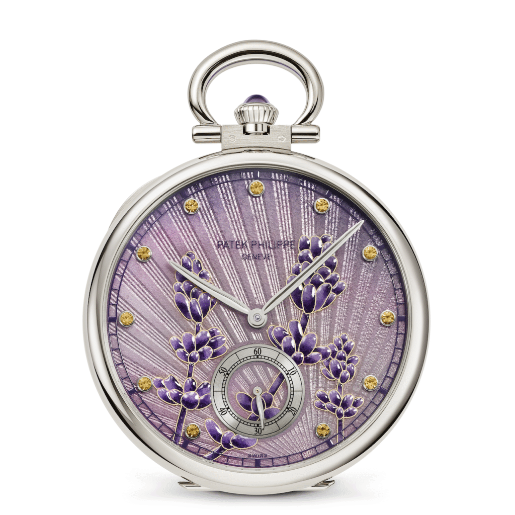 而袋錶方面就有獨一無二的Ref. 992/183G-001「普羅旺斯」,以當地具代表性的薰衣草田為主題。錶殼底蓋以手工綴以放射狀交錯飾紋,並添加半透明琺瑯,之後以大明火掐絲琺瑯工藝,用上長約97厘米、重約0.84克的金線,配合45種半透明、不透光、半透光和透乳白光的琺瑯釉色,呈現花朵的色彩和立體感,再以微繪琺瑯工藝,用兩種釉色描繪出局部細節。錶盤亦以類似手法打造,先以手工綴以放射狀交錯飾紋,之後以大明火掐絲琺瑯工藝,用上長約42厘米、重約0.36克的金線,配合12種半透明和不透光琺瑯釉色製作而成;鑲有橙色藍寶石小時時標,白金葉形指針。白金錶殼直徑44.1毫米,錶冠鑲有一顆重約0.31克拉的淺紫色凸圓藍寶石;搭載17’’’ LEP PS手上鍊機芯。袋錶掛架以白金打造,並綴以薰衣草造型的紫龍晶裝飾、一隻手工雕製的黄金蜜蜂,以及一顆重約0.41克拉的淺紫色凸圓藍寶石,底座則以粉紅色蛋白石作。袋錶亦配有一條白金錶鏈,搭配手工雕製的黄金蜜蜂,以及兩顆共重約1.90克拉的紫龍晶裝飾。