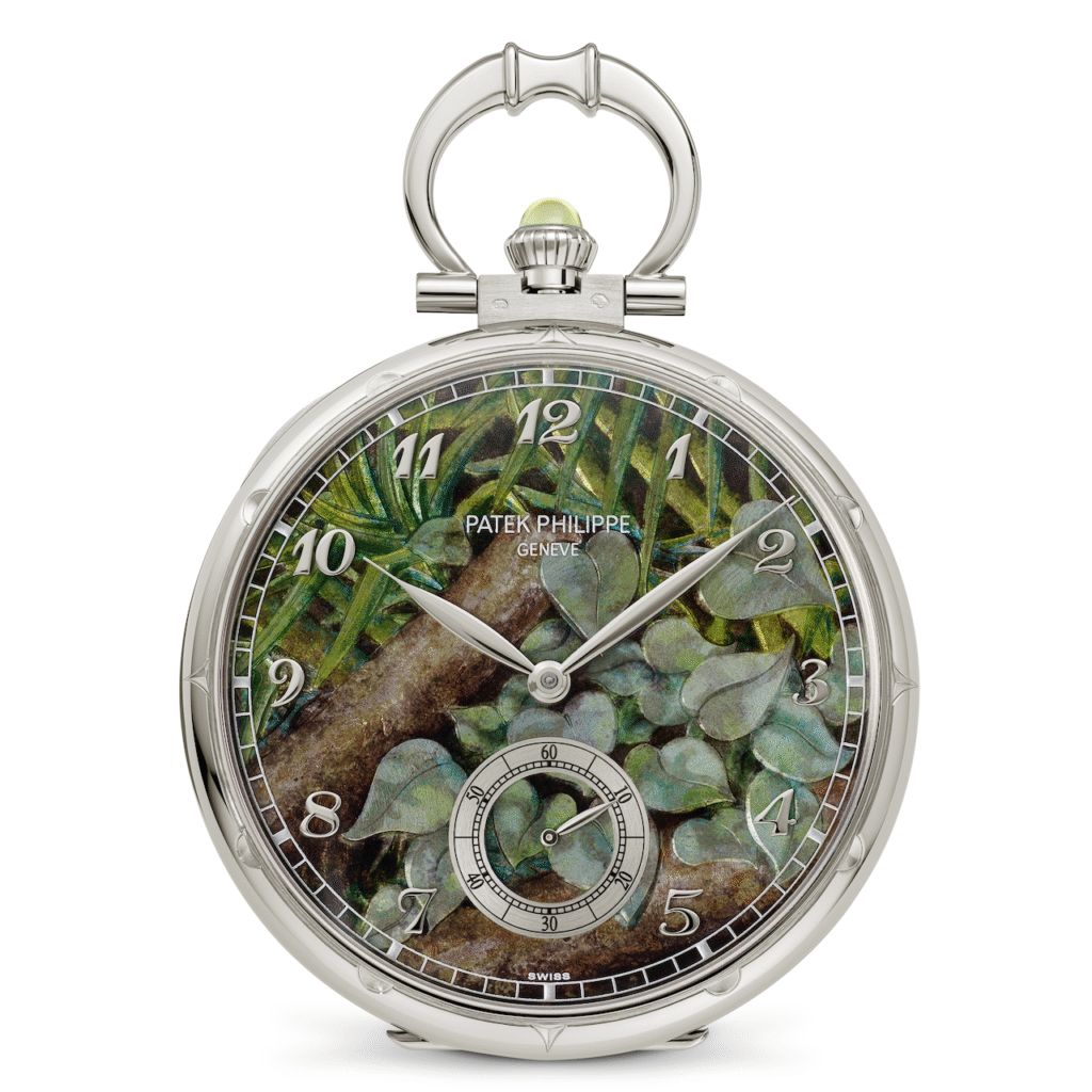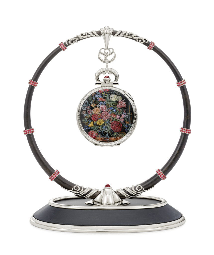 袋錶方面就有獨一無二的Ref. 992/188G-001「花卉與昆蟲」,創作靈感源自17世紀荷蘭畫家Van Suchtelen的靜物名作,豐盈繁茂的花束間雜着蝴蝶、蛞蝓、草蜢和蜘蛛等昆蟲。圖畫以微繪琺瑯製作,運用了多達19種琺瑯色調,當中包括6種混合釉色,再添上數層透明琺瑯以作保護,整幅畫作需以攝氏800至830度燒製22次而成。白金錶殼直徑44.1毫米,錶殼底蓋邊緣、錶圈和扣環均以線雕方式刻有花卉飾帶,錶冠則鑲有一顆重約0.31克拉的凸圓紅色尖晶石;黑色不透光琺瑯錶盤,小秒針錶盤以手工綴以交錯飾紋,再覆以紅色半透明琺瑯,搭配白金立體寶璣式數字小時時標和葉形指針;搭載17’’’ LEP PS手上鍊機芯。袋錶掛架和底座以白金及來自剛果盆地的黑檀木由人手打造,鑲有128顆共重約1.25克拉的紅色尖晶石,以及一顆重約0.38克拉的紅色凸圓寶石。袋錶亦配有一條綴以玫瑰金吊飾的白金錶鏈。