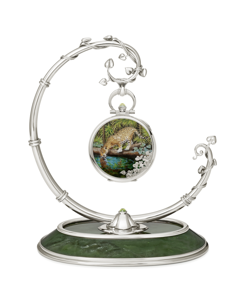 另一枚吸引我眼球的作品是獨一無二的Ref. 995/125G-001「美洲豹」袋錶,雕刻工匠先在錶殼底蓋上雕刻4層構圖,然後琺瑯工匠以微繪琺瑯工藝描繪美洲豹的輪廓,再覆以25種不透光、半透光、半透明和透乳白光的琺瑯釉色,並以攝氏超過820度烘燒25次,最後再由雕刻工匠重塑葉片部分的浮雕層次。而錶盤則經手工雕刻3層構圖,再添上約15種半透明琺瑯釉色,並以攝氏超過820度烘燒15次。白金錶殼直徑44.1毫米,厚度9.1毫米,錶冠鑲有一顆重約0.35克拉的淺藍色凸圓形橄欖石;搭載17’’’ LEP PS手上鍊機芯。袋錶掛架以白金打造,並綴以藤蔓圖案裝飾,亦鑲有一顆重約0.38克拉的橄欖石,橢圓形底座則以英屬哥倫比亞玉製作。袋錶亦配有一條白金錶鏈,搭配重約2.68克拉的英屬哥倫比亞玉球和人手打造的葉片裝飾。