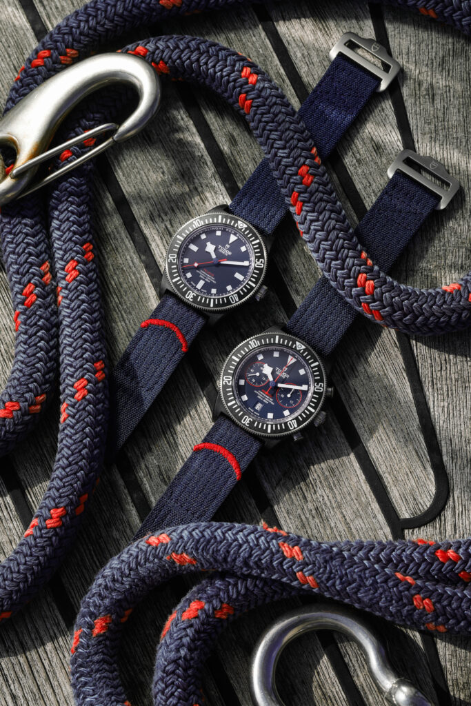 要數最矚目、必看的焦點,無疑是Tudor為Alinghi Red Bull Racing帆船隊設計的兩枚腕錶,分別是Pelagos FXD和Pelagos FXD Chrono,藍、黑和紅的配色讓人第一時間便聯想起帆船隊,Pelagos FXD和Pelagos FXD Chrono分別採用直徑42毫米和43毫米啞黑色碳複合材質錶殼,配鈦金屬雙向旋轉錶圈,而錶底蓋則由不鏽鋼打造並刻有船隊標誌,上手非常輕巧,與帆船隊出征美洲盃時所用的單體水翼船AC75船體結構如出一轍,搭配由法國St – Etienne地區一家名為Julien Faure的家族企業製作的藍色織紋錶帶。
