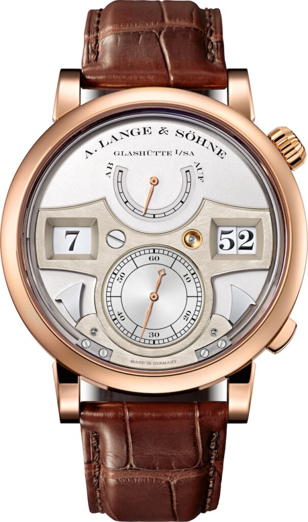 ZEITWERK Date於2019年首度亮相,今年朗格就為ZEITWERK Date腕錶換上新衣,推出玫瑰金版本,保留了灰色錶盤的配搭,鍍銠德國銀「時間橋」,襯啡色鱷魚皮錶帶及玫瑰金針扣。錶殼直徑44.2毫米,厚度12.3毫米,同樣搭載L.043.8手上鍊機芯,3/4夾板由未經處理的德國銀製造,手工雕刻擺輪和擒縱輪夾板,還有鵝頸微調、藍鋼螺絲、黄金套筒等傳統德國高級製錶特色;備恆定動力擒縱系統,外環式日曆顯示,6時位置設有小秒針,12時位置則設有動力儲存顯示;2.5 Hz擺頻,動力儲存約72小時。錶殼側4時和8時位置的按扭分別用於校正小時和日期顯示。