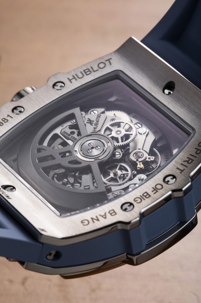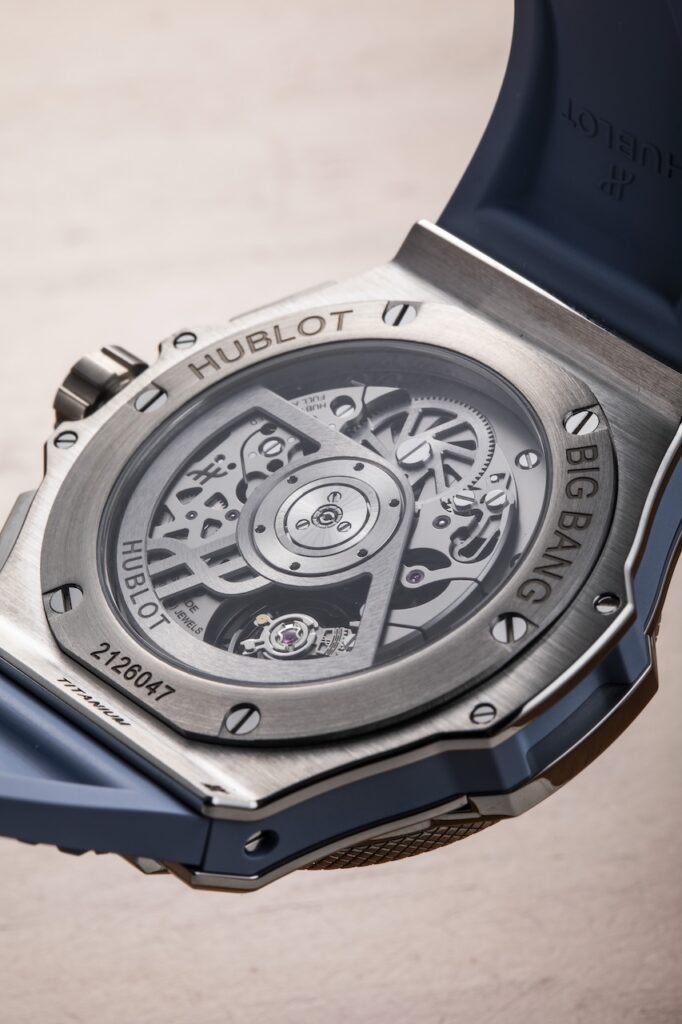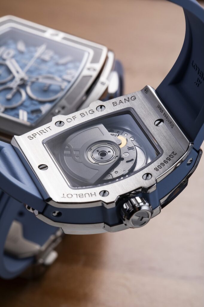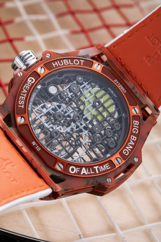 新錶所搭載的MHUB6035陀飛輪自動機芯,造型亦延續了網球的基因。工程師以0.55毫米粗的「球拍網」取代傳統的實心主夾板,並刻意營造不規則的網格,以模仿網球拍在比賽中擊球後所產生的變化。而這塊網狀主夾板,則以雷射雕刻技術製作,再經黑色PVD塗層處理,並印有祖高域個人專屬的白色ND1標誌。此外,發條盒的大鋼輪先經過鍍銠拋光處理,然後以雷射雕刻技術營造網球的質感,最後再塗上一層綠色的亮漆,配合球拍網格紋的主夾板,大鋼輪就變成球拍上的網球。其他機芯的細節位還包括電鍍了與錶殼相同顏色的鈦金屬陀飛輪框架和鍍銠22K紅金微型擺陀;3 Hz擺頻,動力儲存約72小時。