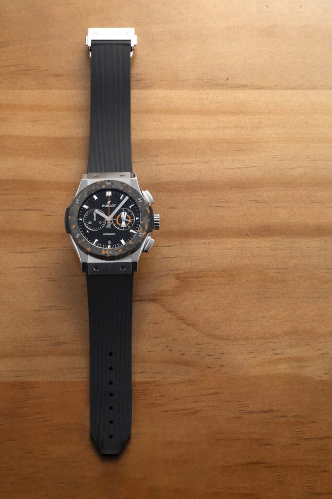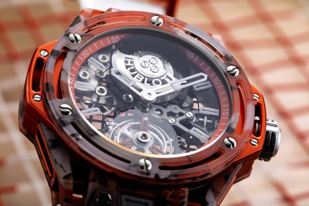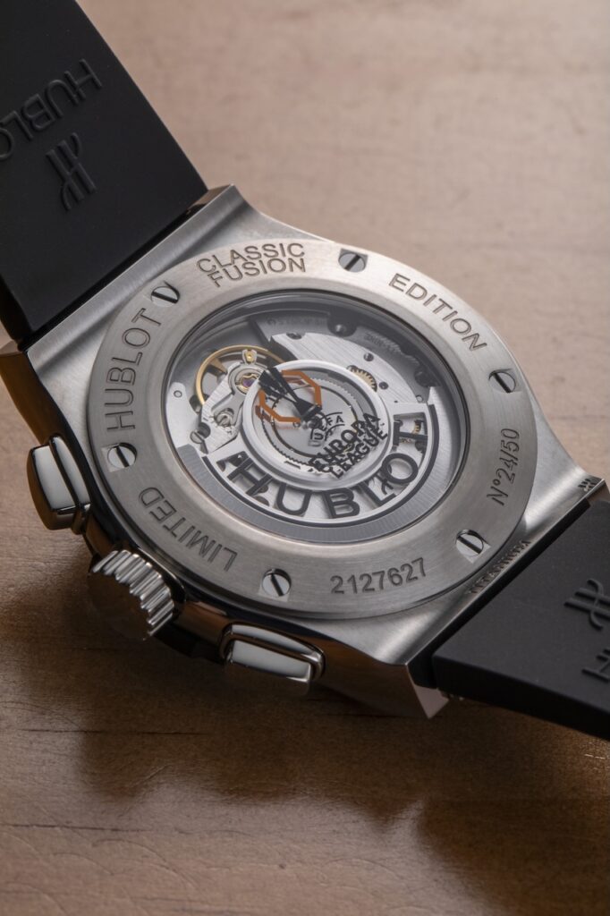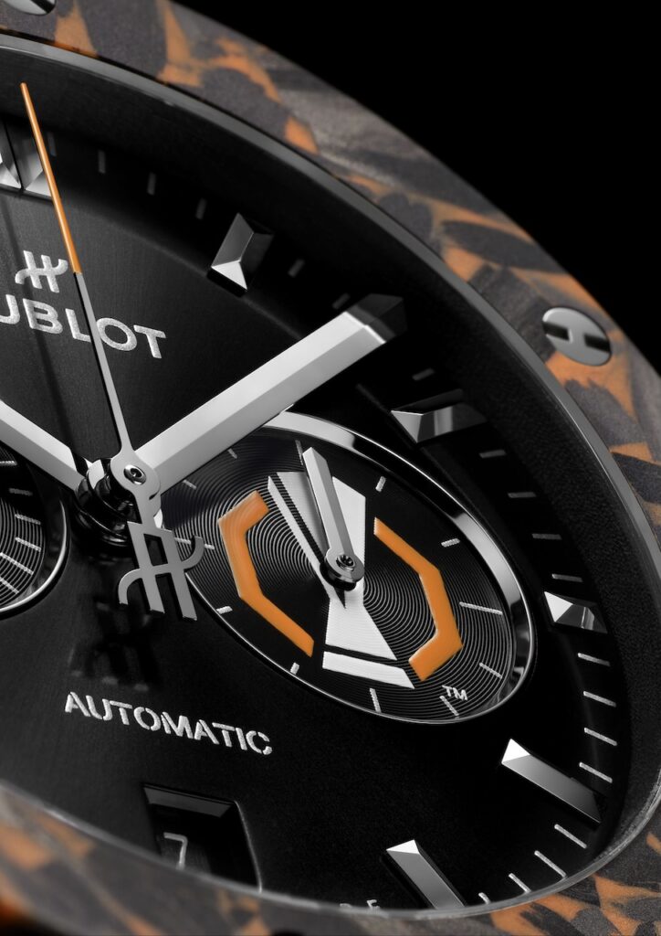 另一枚跟運動有關的聯乘新作是Classic Fusion Chronograph UEFA Europa League Titanium Carbon,品牌與UEFA歐洲足協Europa League歐霸盃的合作始於2015年,並分別於2017年和2023年推出過兩款限量版腕錶,今年品牌再為此歐洲足球界重要賽事推出全新的Classic Fusion Chronograph UEFA Europa League Titanium Carbon腕錶,限量50枚。新錶採用直徑42毫米鈦金屬錶殼,錶圈則以碳纖維打造而成,並滲入橙色微玻璃纖維,以配合歐霸盃的色調,黑色錶盤3點位置的小秒盤和錶背的藍寶石水晶玻璃上均飾有歐霸盃的官方標誌,亦刻有限量編號;搭載HUB1153計時自動機芯,鍍銠鎢金屬擺陀,4 Hz擺頻,動力儲存約48小時。售價約$109,700。