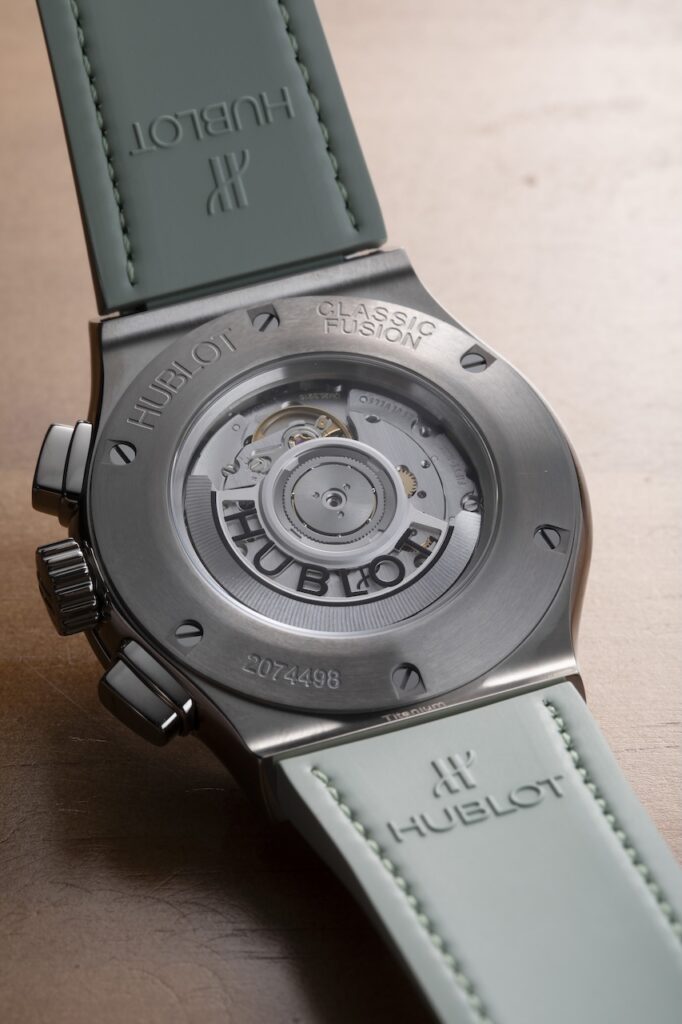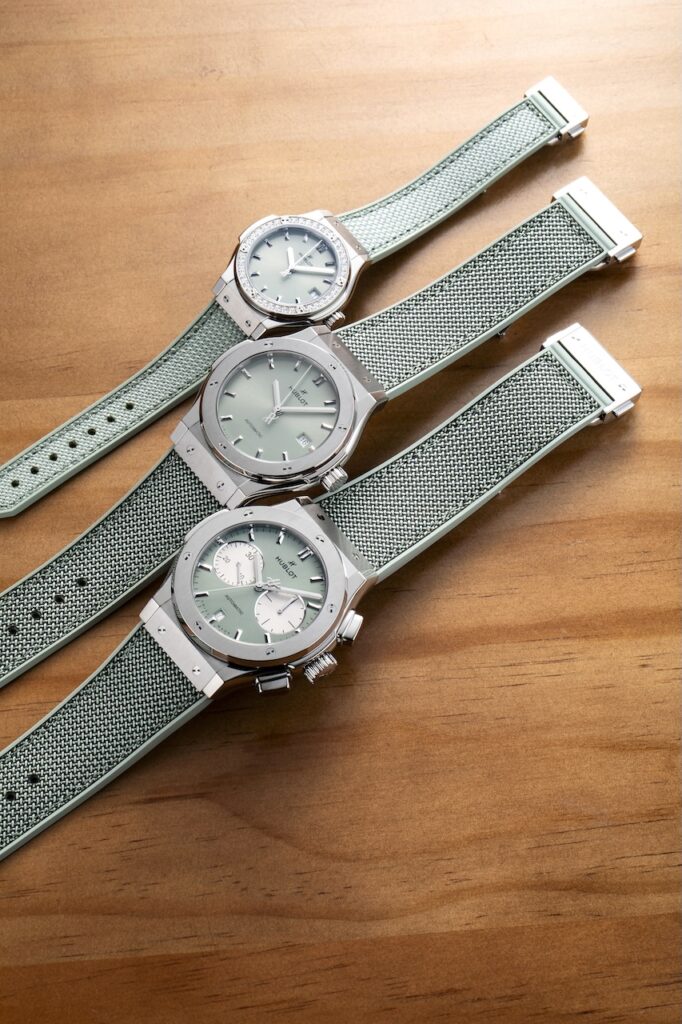 另一個配色Sage Green則有三個同樣是Classic Fusion系列的不同款式,全部採用鈦金屬錶殼襯鼠尾草綠色太陽射線紋錶盤。Classic Fusion Chronograph Titanium Sage Green錶殼直徑45毫米,搭載HUB1143計時自動機芯,售價約$91,000;Classic Fusion Titanium Sage Green錶殼直徑42毫米,搭載HUB1110自動機芯,售價約$65,500;Classic Fusion Titanium Sage Green Diamonds錶殼直徑33毫米,錶圈鑲有36顆共重約0.8克拉圓鑽,搭載HUB2912石英機芯,售價約$77,400。