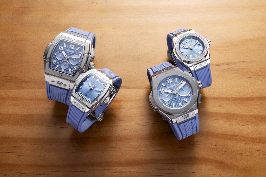 Hublot不只是聯乘做得出色,品牌更是鐘錶界中用色最前衞大膽的品牌,沒有之一,紅橙黄綠青藍紫,說得出、說不出的顏色,他們都夠膽用,只要你夠膽戴。今年品牌推出兩個充滿青春活力的全新配色,包括Coal Blue煤藍色和Sage Green鼠尾草綠色。Coal Blue共有四個不同款式,Big Bang Original Unico Titanium Coal Blue採用直徑43毫米鈦金屬錶殼和錶圈,煤藍色碳纖維格紋錶盤,搭載HUB1280 Unico飛返計時自動機芯,售價約$143,800。Spirit of Big Bang Titanium Coal Blue採用42毫米闊鈦金屬錶殼,煤藍色碳纖維格紋錶盤,搭載HUB4700計時自動機芯,5 Hz高擺頻,動力儲存約50小時,售價約$169,300。另外兩個女裝款式分別是Big Bang One Click Coal Blue Diamonds和Spirit of Big Bang Coal Blue Diamonds,均採用不鏽鋼錶殼,襯煤藍色太陽射線紋錶盤;前者直徑33毫米,錶圈鑲有36顆共重約0.76克拉圓鑽;後者闊32毫米,錶圈鑲有44顆共重約0.7克拉圓鑽;同樣搭載HUB1120自動機芯,大三針加日曆功能,4 Hz擺頻,動力儲存約40小時;售價分別約$109,700和$126,800。