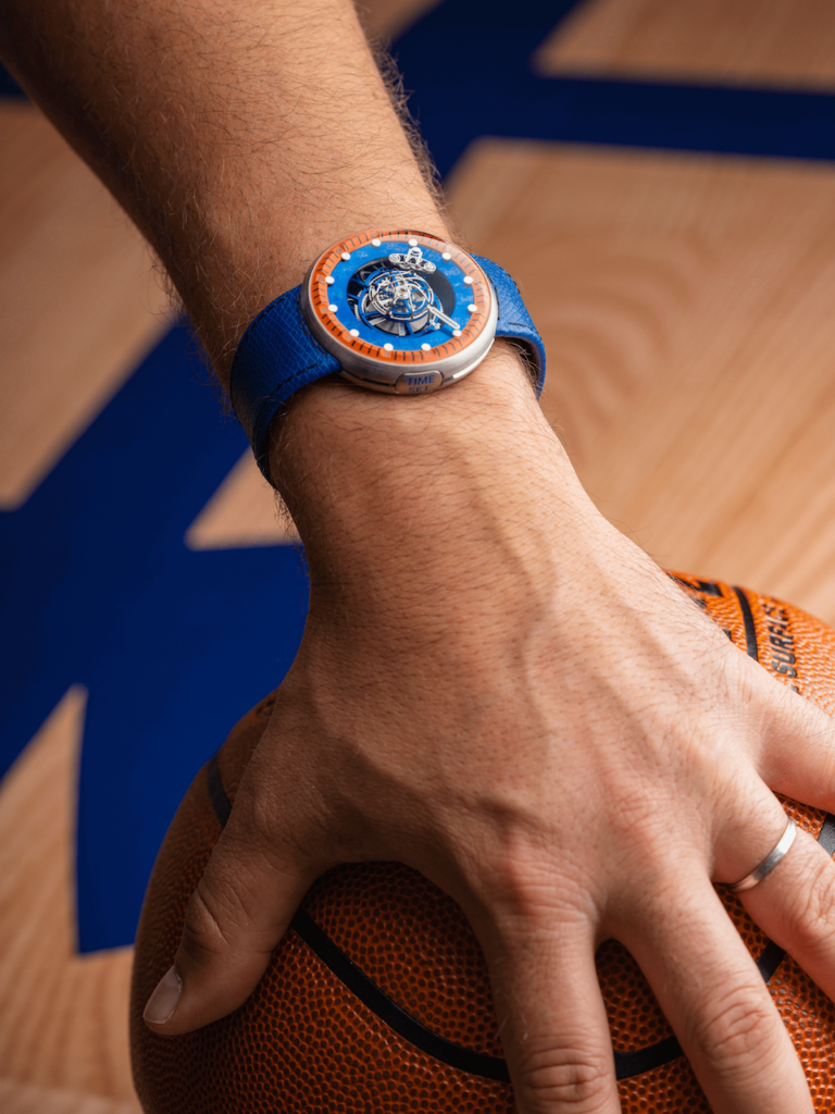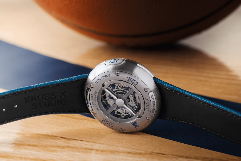 腕錶搭載Kross Studio自家研發的 KS 7’000中置陀飛輪機芯,提供5天動力儲存。這枚直徑45毫米的鈦金屬腕錶更採用了設於錶背的D型環圈隱藏式錶冠,保持錶殼線條俐落。此外,這套珍藏組還附贈一件藝術品級數的配件:一個由鋁和木材製成的巨大籃球造型雕塑,它同時也是腕錶的專屬收納盒,設計巧思令人讚歎!