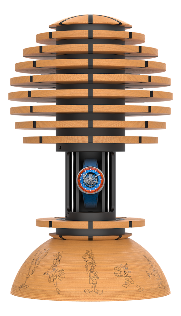 套裝的焦點當然是Space Jam Tourbillon陀飛輪腕錶,在設計上滿載驚喜:錶盤上,時標由Bugs Bunny、Lola Bunny、Daffy Duck、Tweety to Sylvester及Marvin the Martian等Tune Squad隊員組成;獨特的時針設計成籃球場上的罰球區(Key)形狀,細節滿分;陀飛輪框架更被設計成籃球造型的鏤空結構,超級吸睛!
