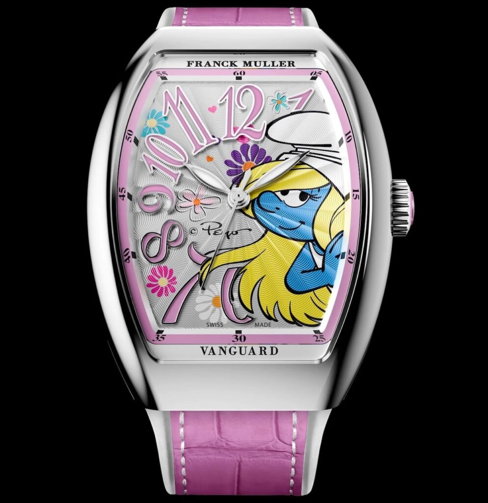 自2021年起,Franck Muller與Bamford Watch Department曾多次合作,逐年推出不同限量版本的Crazy Love Snoopy腕錶。不過,今年7月適逢有《藍精靈大電影》(Smurfs)上映,Franck Muller便暫時將焦點轉向在藍精靈村莊中唯一的女生美芝(Smurfette,電影版由Rihanna聲演),讓她成為品牌招牌酒桶形 Vanguard 錶款的主角,更一口氣推出6款Smurfette Vanguard腕錶,以華麗多采的奢華風格演繹這位藍精靈女神的風采!