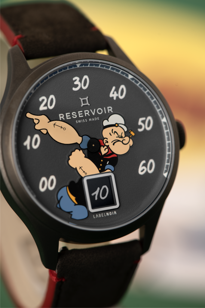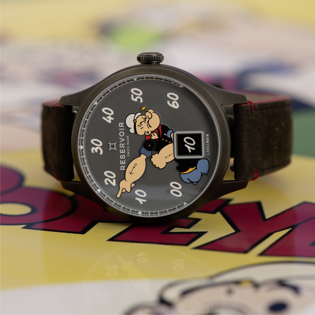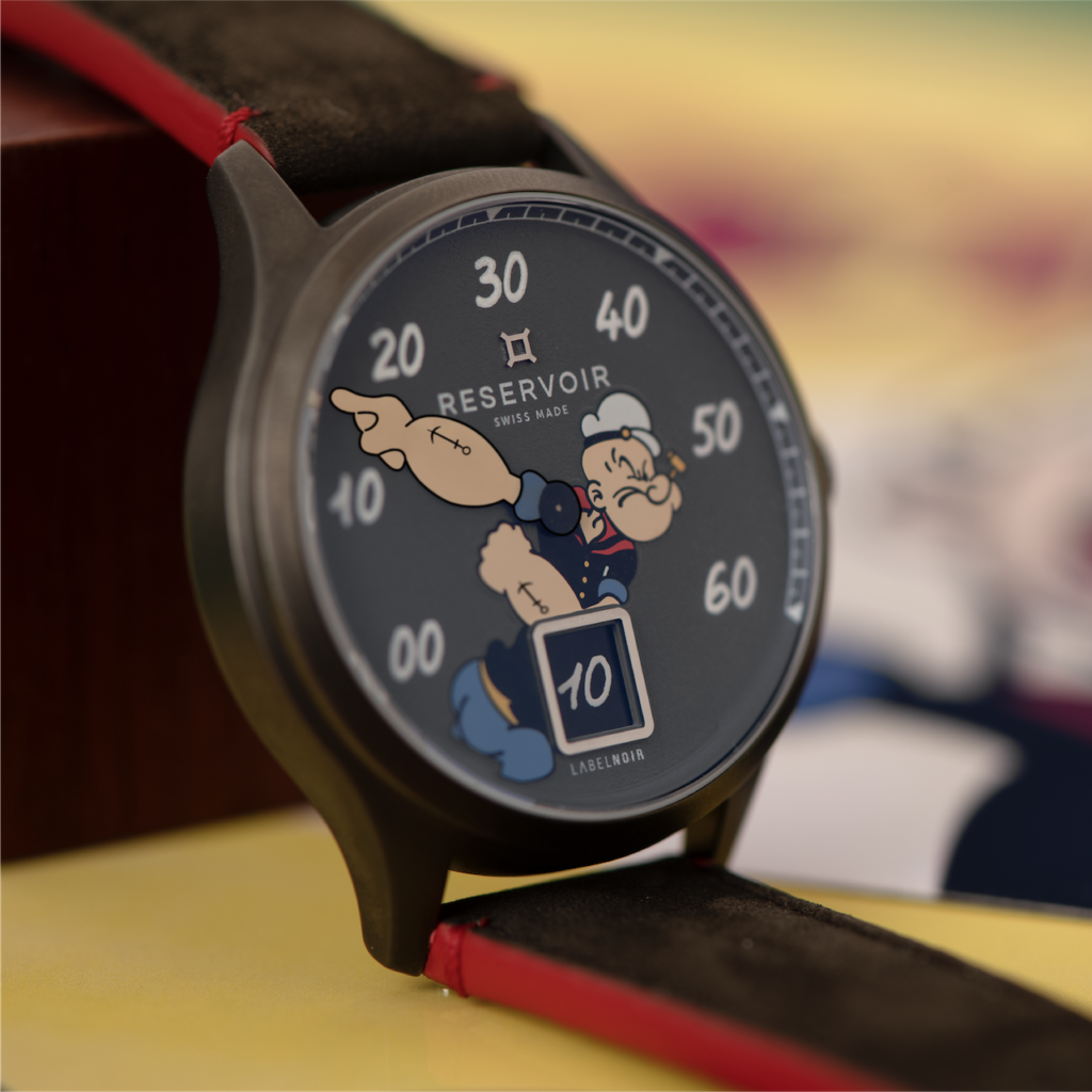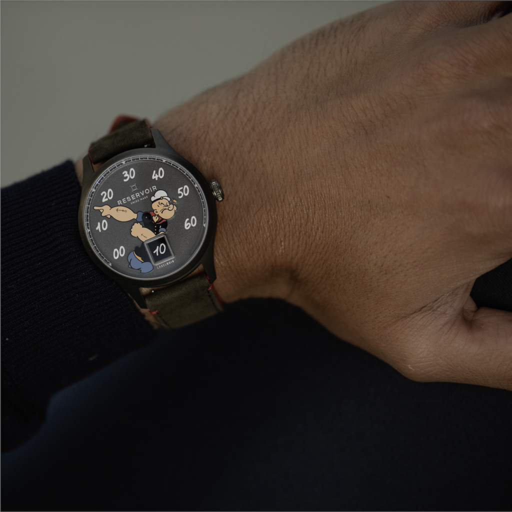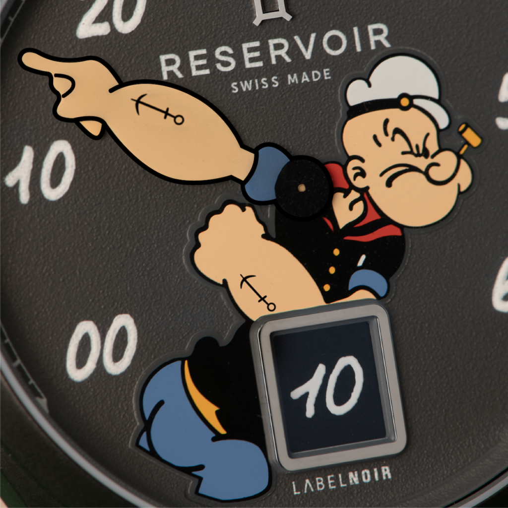 在眾多《大力水手》聯名錶款中,近年來最吸睛、最特別的品牌,非來自法國的Reservoir莫屬!自2023年首度與頂級改裝專家LabelNoir聯手創作Popeye聯名錶款(參考價$41,000,已售罄)以來,Reservoir便憑着Popeye錶一炮而紅。Reservoir的獨特之處在於巧妙運用飛返分鐘指針(Retrograde Minute)結合跳時功能(Jumping Hour)來顯示當下時間。在錶盤上,Popeye的大力手臂就是那根獨特的分針!每當整點來臨,Popeye的手臂便會瞬間彈回起點,數字小時窗隨之跳轉,讓整個計時過程充滿趣味和生命力,完美體現了大力水手隨時準備行動的自信與能量!