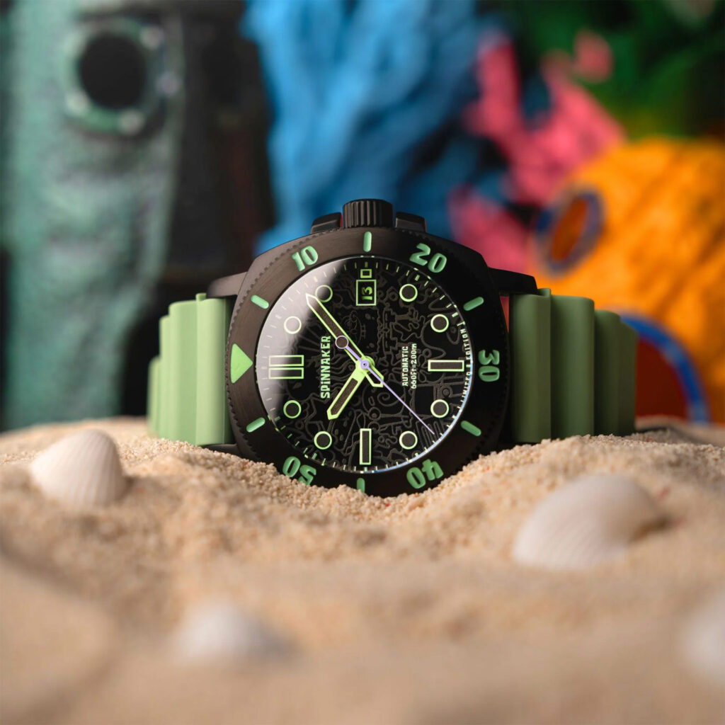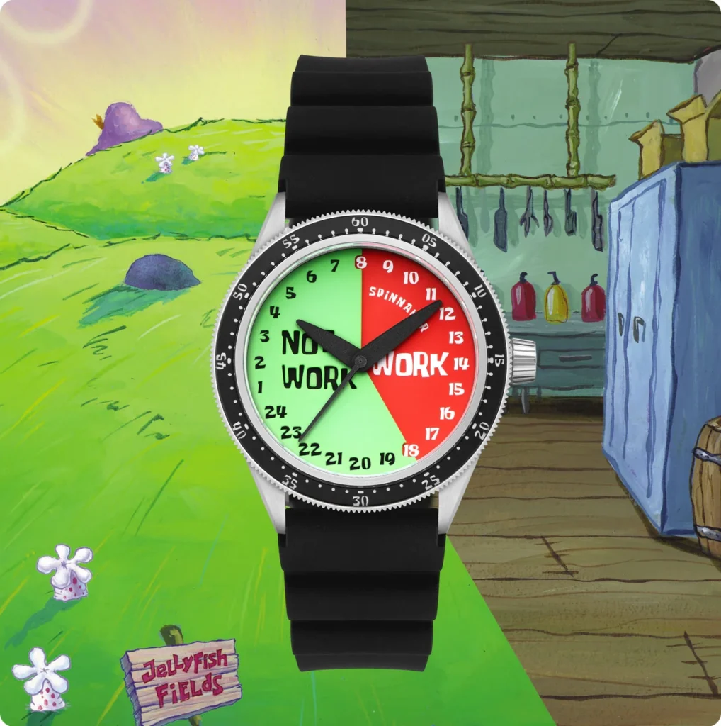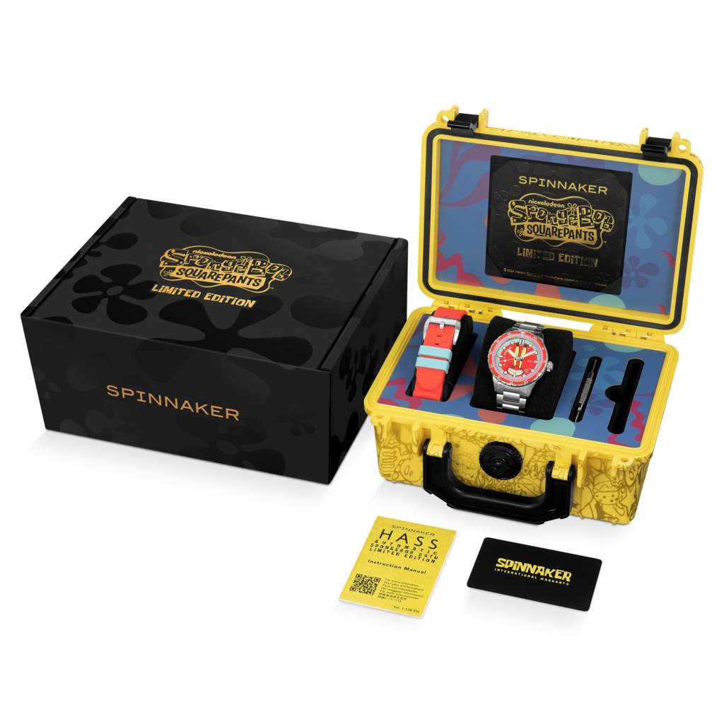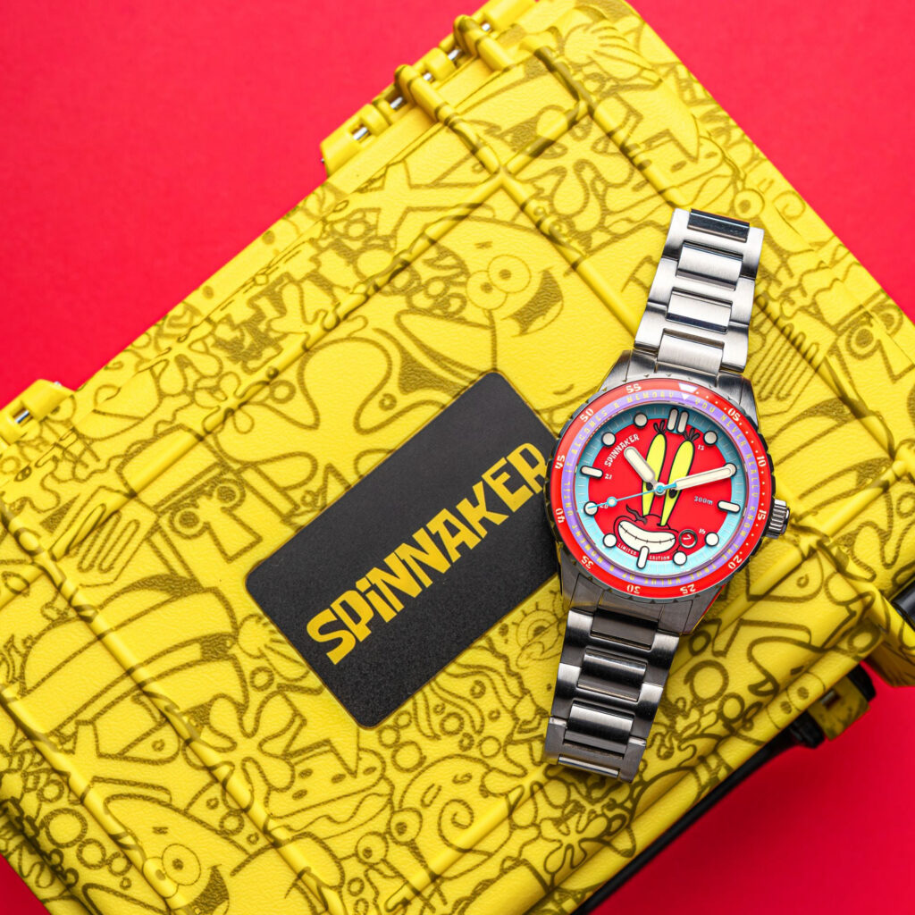 英國潛水錶品牌Spinnaker與Nickelodeon經典卡通《海綿寶寶》(SpongeBob SquarePants)的聯乘可說是一拍即合。這個從去年開始的合作,至今已經推出過無數個系列,包括以品牌Hass錶款為基礎的首個聯乘系列《海綿寶寶》25週年限量版、以卡通中出現過的手錶為設計藍本的三款玩味錶款、以卡通中的Bikini Bottom海底城各種房子圖案設計錶盤並融入Fleuss 錶款的Conch Street系列、以一對眼珠作為計時指示的Fleuss Chronograph系列、配備鏤空錶盤的Croft Mid-size Skeleton 自動錶款、以四位主角的不同顏色及設計兼備有夜光人物線條圖案錶盤的Hull Diver錶款,以及四款最新的《海綿寶寶》Bradner GMT自動腕錶。
