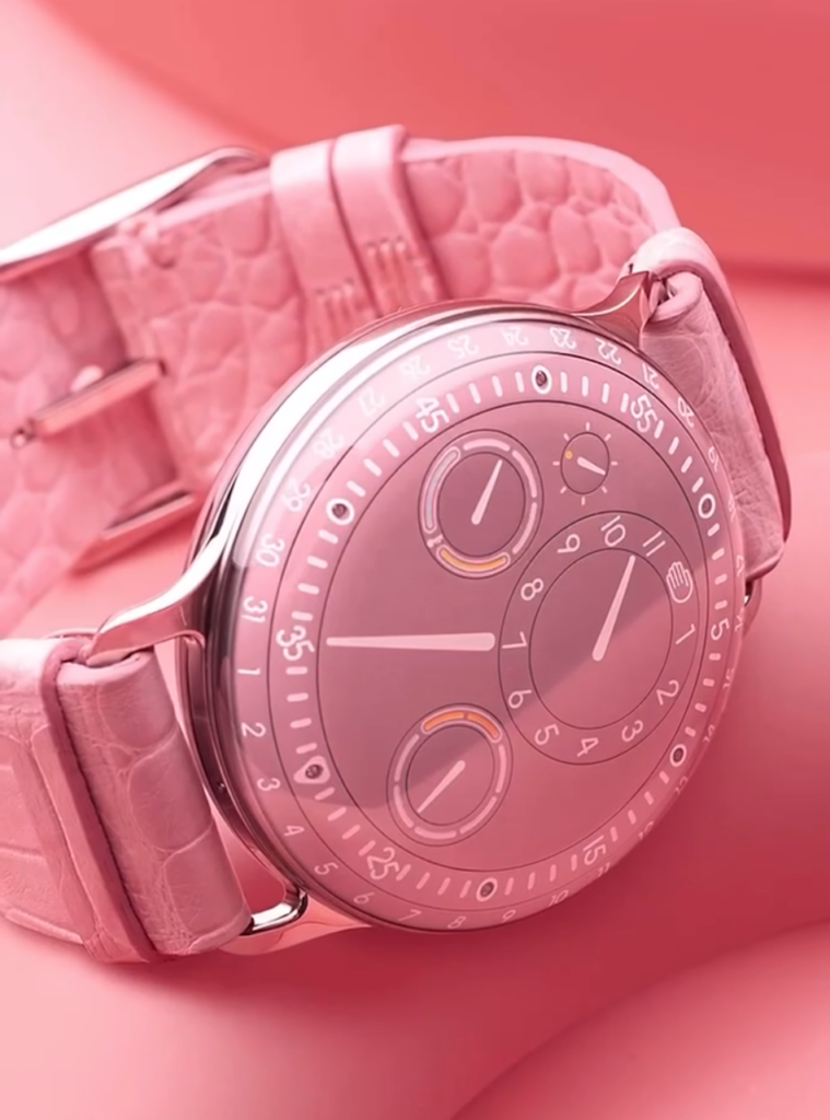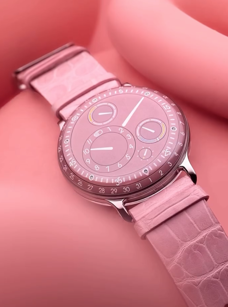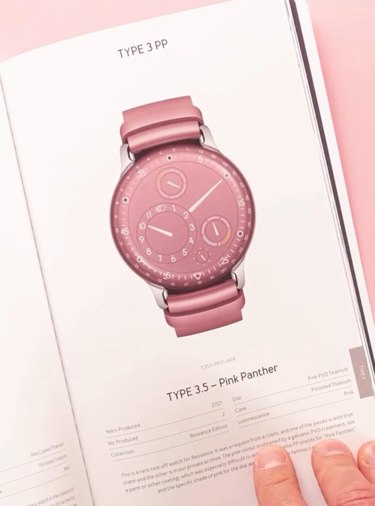 這款極為罕見的錶款,是應一位特殊客戶的要求而製作,並以經典卡通《傻豹》(Pink Panther)命名。Ressence表示只會造兩枚,其中一枚已送到客戶手上,另一枚則藏在品牌的檔案館中。資料提及要把腕錶造成像傻豹一樣精確的粉紅色調絕非易事。它並非簡單的塗漆,而是將粉紅色的 PVD 鍍層應用於鈦金屬之上,透過一個客製化的電鍍工藝實現,而這個過程是製作這枚Type 3 PP的一大考驗。至於此錶的售價,在網上當然是遍尋不着,畢竟這是 Ressence與這位特殊客戶之間的秘密!