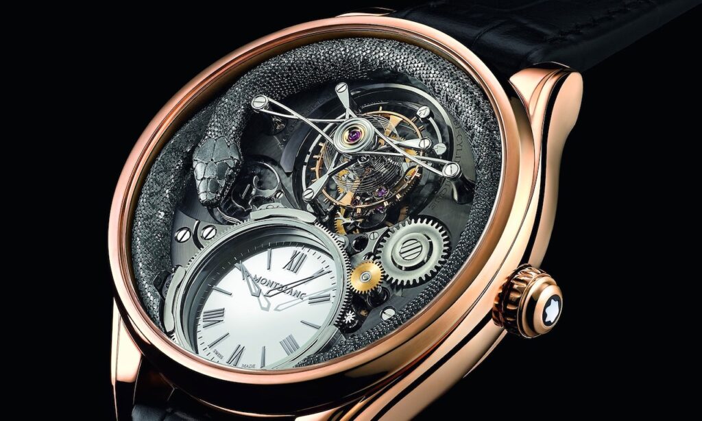 比Hautlence更早製作圓柱形游絲的腕錶品牌有Montblanc,同樣有自家製作游絲的能力。品牌早在2011年推出雙圓柱型游絲陀飛輪腕錶,其厲害之處是不只將一組圓柱型游絲放到腕錶之中,更是將兩組圓柱型游絲結合!兩組游絲以一內一外方式放置,循相反方向運作。由於兩組游絲的扭力相同,能夠進一步加強等時性,讓走時更穩定精準。此雙圓柱型游絲搭載在陀飛輪之中,陀飛輪框架上也備有3個刻有Minerva錶廠古老箭頭標誌的活動砝碼,方便調校。單是製作這個陀飛輪組件便需要3個星期。