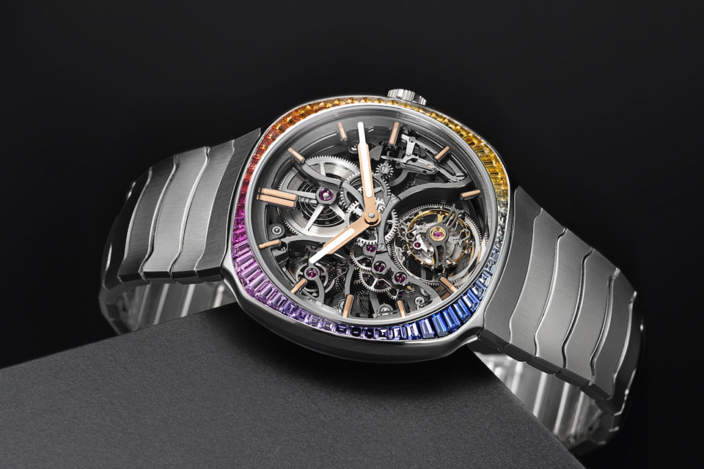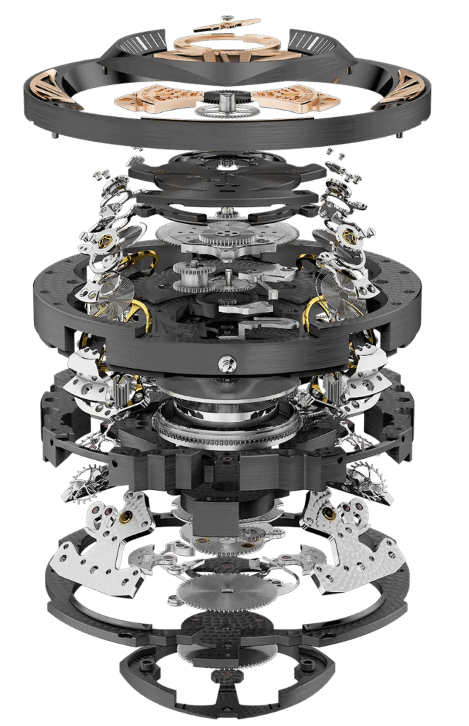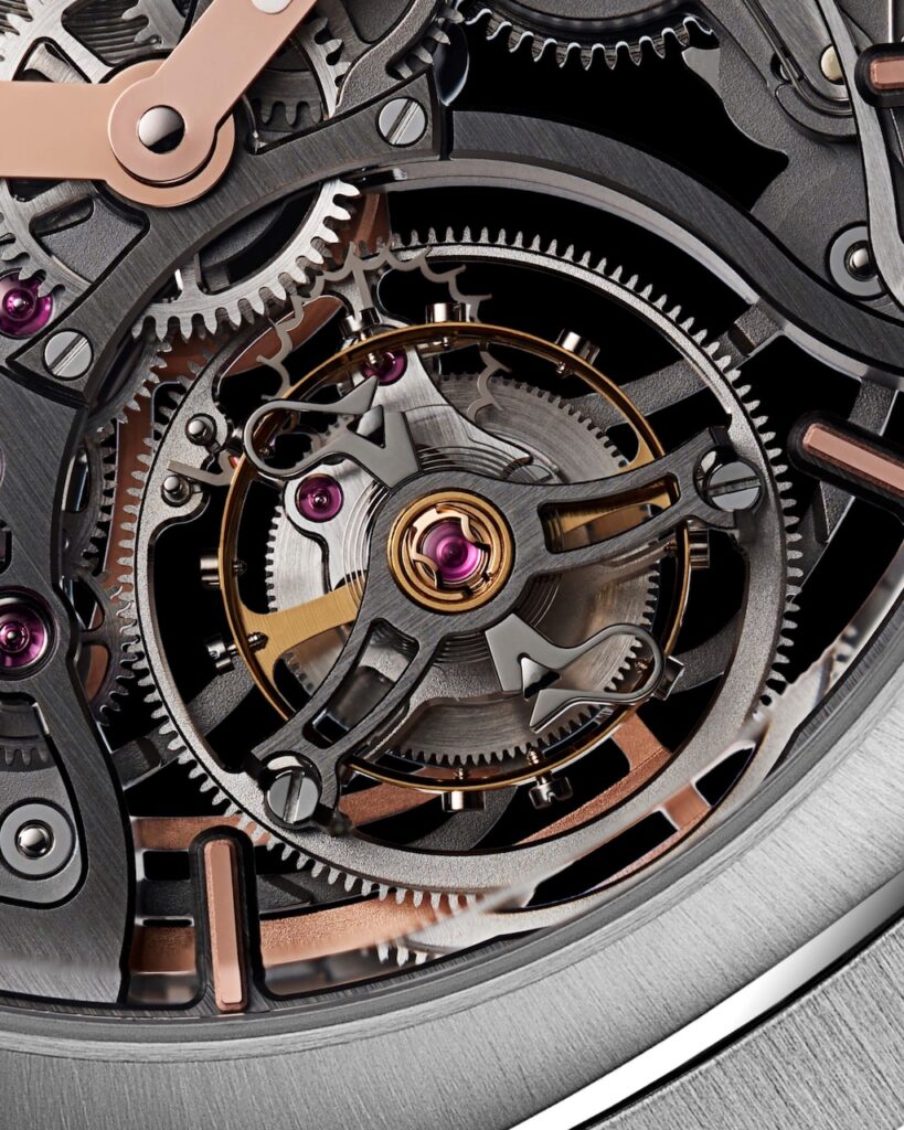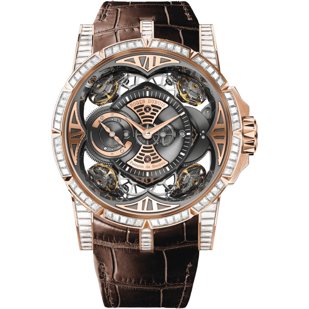 以上提到的幾款特別設計游絲剛好都搭載在陀飛輪之中,但Roger Dubuis則另闢路徑,不採用陀飛輪的設計,而在腕錶中用上4組擺輪游絲的設計!搭載Quatuor四擺輪游絲的RD101機芯歷經7年研發而成,4個呈90度角傾斜配置的擺輪游絲配對運作,用5組差動器連接,能夠隨佩戴者的不同手腕位置抵消地心引力作用對走時的影響。自2013年面世以來,四擺輪游絲系統曾以矽質、玫瑰金、DLC鈦金屬、CarTech Micro-Melt BioDur CCM鈷鉻鉬合金、複層碳纖維等款式演繹,愈出愈有。