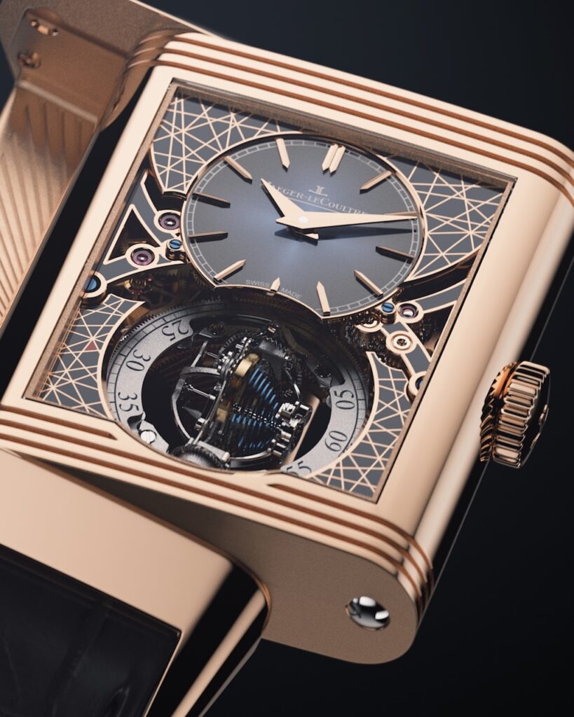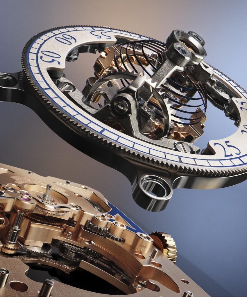 游絲當然要呈圓形才能夠同心擺動,維持穩定頻率。但除了平面的圓形、向上延伸的圓柱型,真的再沒有其他可能嗎?Jaeger-LeCoultre在2004年推出了首代球體陀飛輪Gyrotourbillon 1,採用雙軸式設計,將平面游絲置在不同速度轉動的內外雙層框架中,消除地心引力影響;第二代在2008年面世,內框轉速較前代快,游絲被換成等時性較佳的圓柱型設計;之後到2013年的第三代,品牌更創新地研發出配備兩個末端曲線的球狀游絲,為全球首枚球狀游絲設計的腕錶,在等時性方面有更出色的表現!搭載Gyrotourbillon 3的176手上鍊機芯以雙軸結構運轉,外框架轉動一周需時60秒,內框架則需24秒,設計師特別將上錶橋移除,讓大家更容易觀賞整個機械的運作。