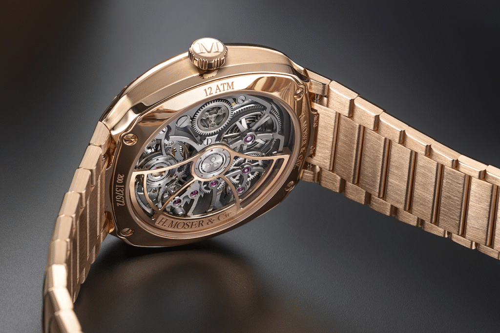 H. Moser & Cie.在2007年開始採用雙游絲系統,品牌的雙游絲系統是在同一枚擺輪上安裝兩枚捲曲、方向相同、但固定位置相對的游絲,所以兩根游絲會同步收放,但移動方向卻剛好相反,由此抵銷單一游絲收放時重心位移的問題。根據品牌的檢測資料,一般平面游絲在收放時的重心位移大約為0.3毫米,寶璣式游絲能夠大幅縮減至0.05毫米,但Moser的雙游絲卻幾乎沒有位移!品牌機芯的游絲樁設計也別具特色,以鵝頸式結構固定游絲末端,故只要看到擺輪上有兩個鵝頸式結構,便知道該機芯搭載雙游絲。品牌目前僅在陀飛輪機芯中採用雙游絲系統,例如最近推出的Streamliner Tourbillon Skeleton Rainbow。