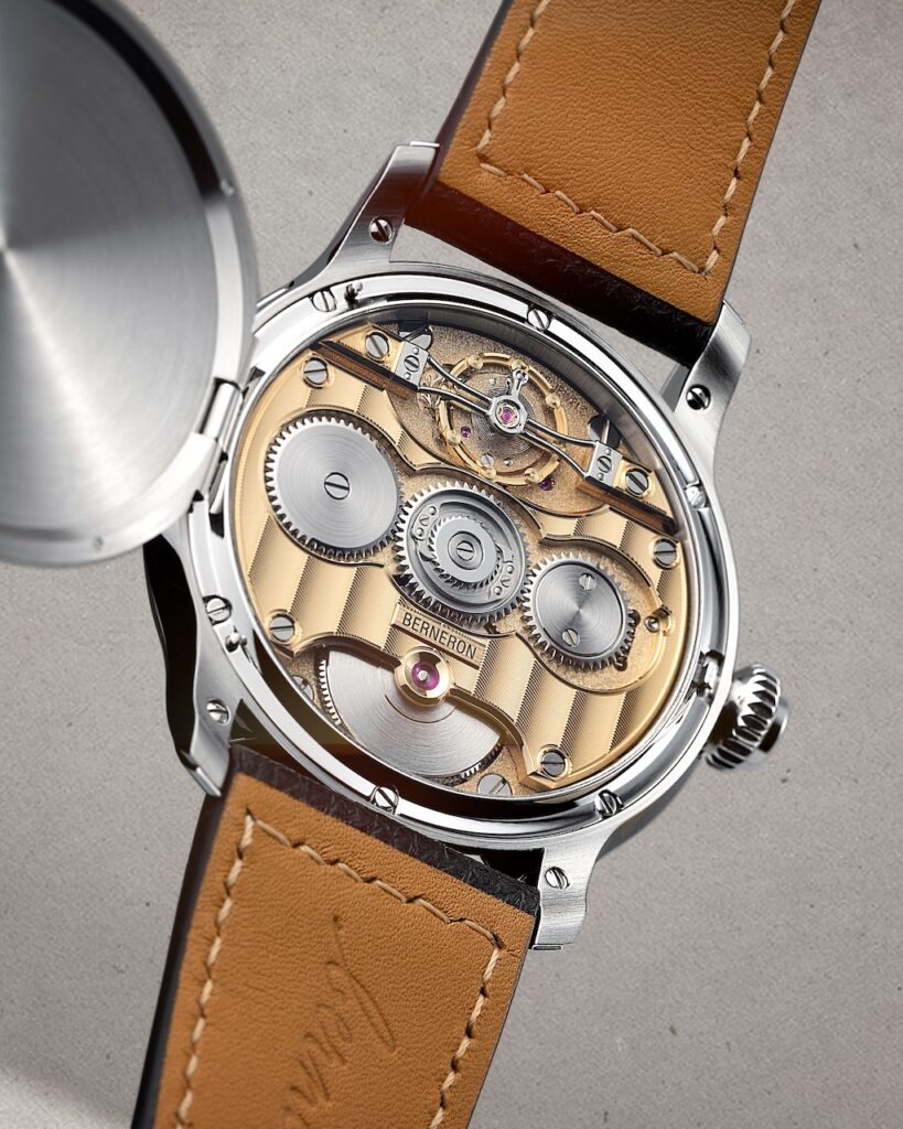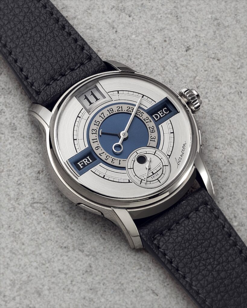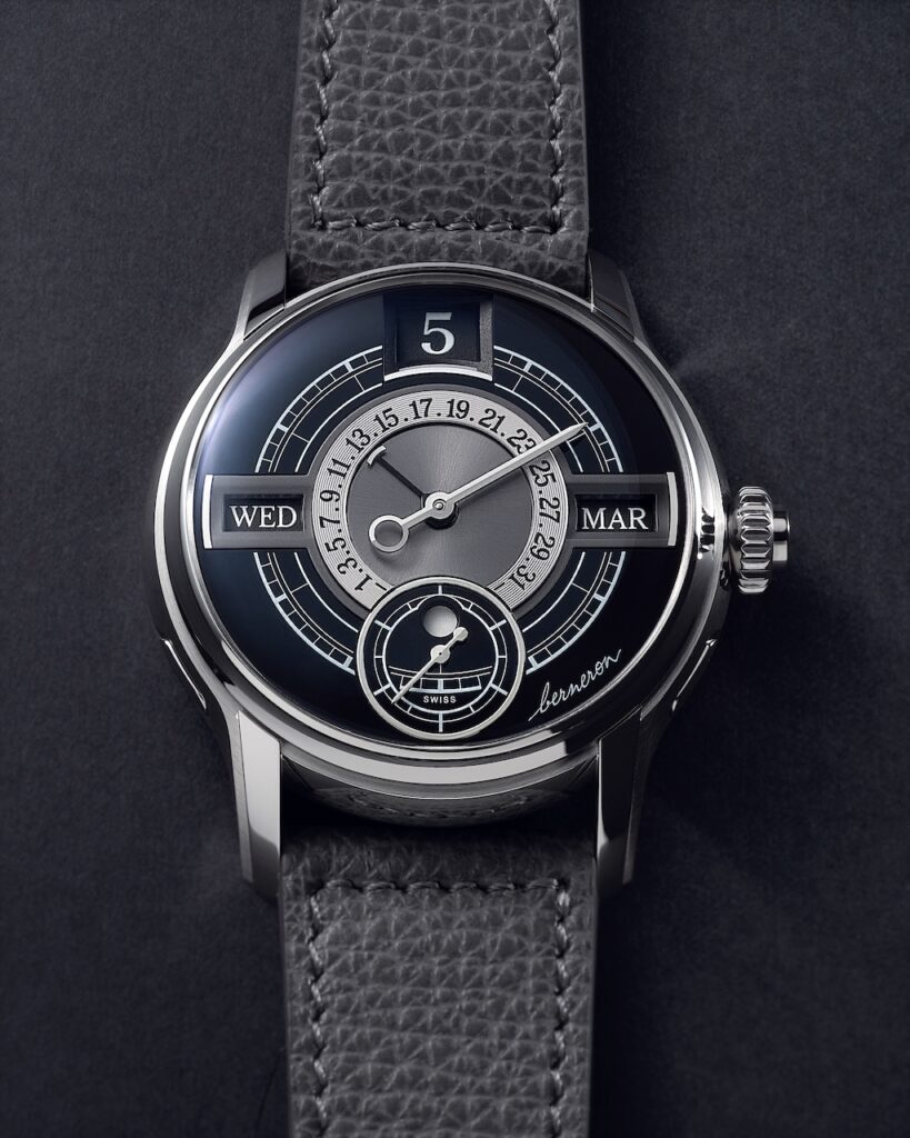 瑞士獨立製錶品牌Berneron去年一改過去扭曲不對稱的設計風格,回歸圓形對稱美學,以「上下看時間,左右看日期」的十字軸布局,重新定義年曆腕錶的顯示方式。這種形式由4個瞬跳視窗、2根掃式指針以及逆跳日期組成。包括小時、星期、月份視窗以及日夜顯示的「四重瞬跳」功能,皆在午夜瞬間完成切換。儘管驅動多項瞬跳功能需要龐大能量,機芯的雙發條盒依然提供了長達100小時動力儲存,更配置了專利安全裝置。即使在深夜調整也無損齒輪,令這枚年曆腕錶更適合日常佩戴。
