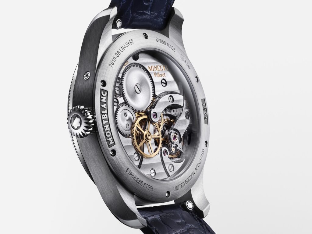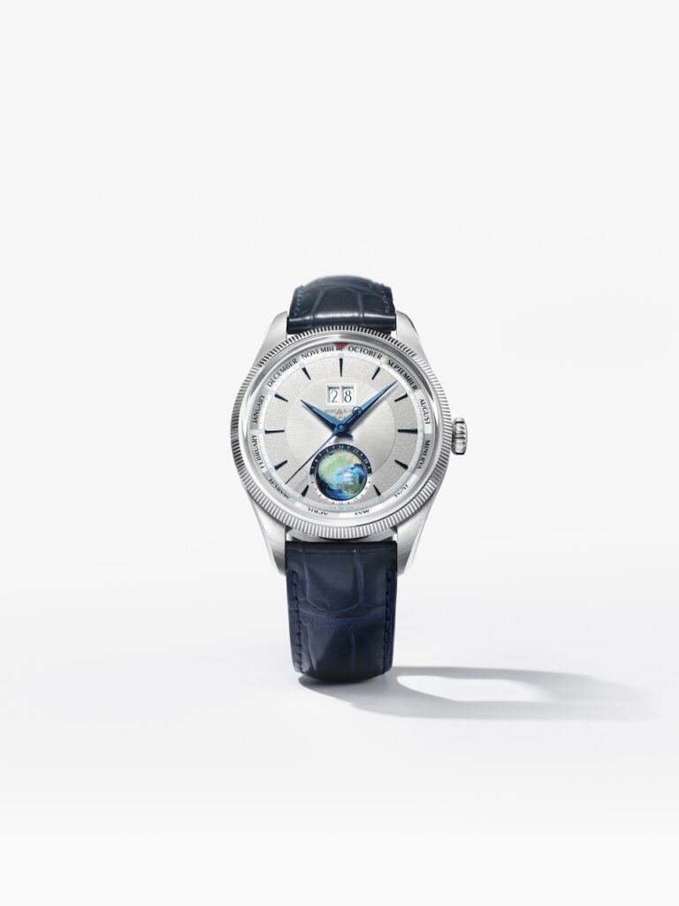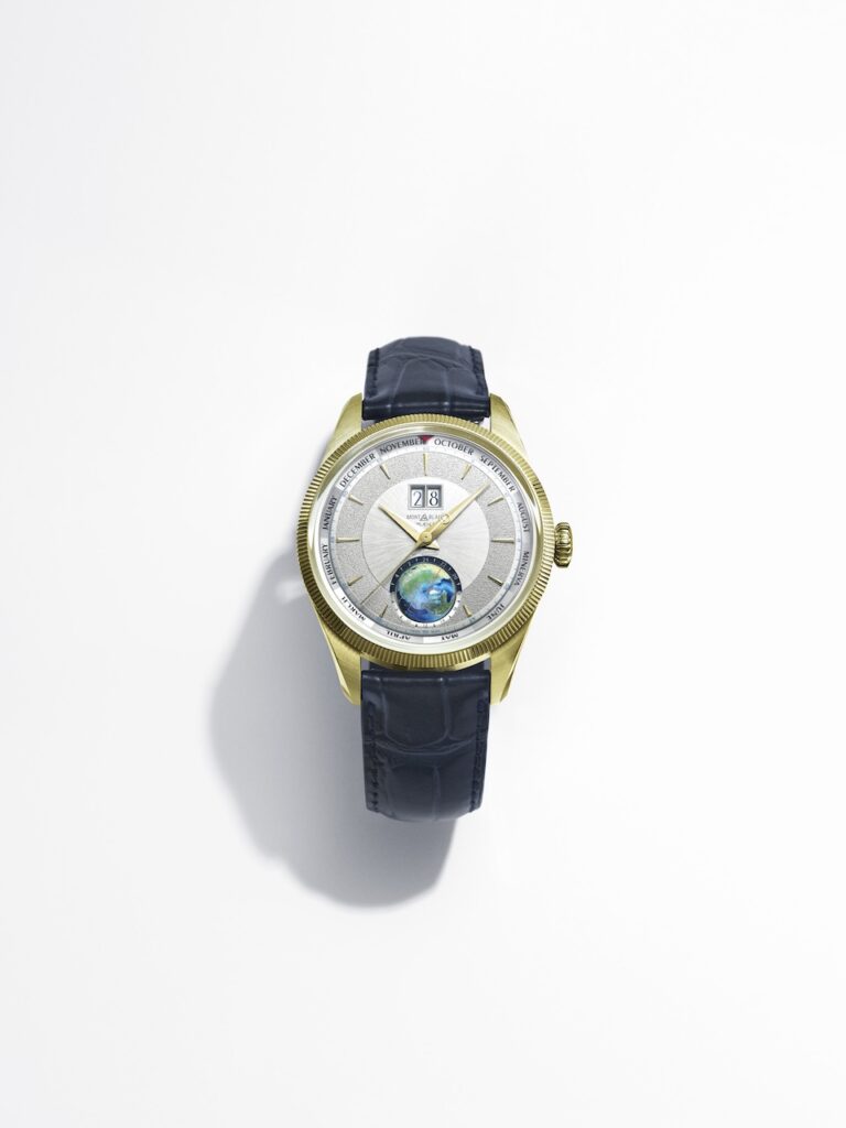 去年面世的這款Montblanc新作,首次將Geosphere世界時區與年曆功能結合,並搭載了Minerva手上鍊機芯。兩款分別限量30枚的18K Lime Gold及100枚的白金錶圈精鋼錶殼版本,設計靈感源自1950年代Minerva的經典美學。在直徑42毫米的錶殼內,搭載的MB M14.58手上鍊機芯整合了年曆、大日曆與世界時區功能。12點鐘設有雙日曆窗,月份則顯示於錶盤外圈,原本7月的位置被替換成了「MINERVA」,以紀念1887年7月Minerva商標正式註冊。視覺焦點是6點鐘方向的手繪3D北半球旋轉地球儀,具備日夜顯示與24小時刻度。