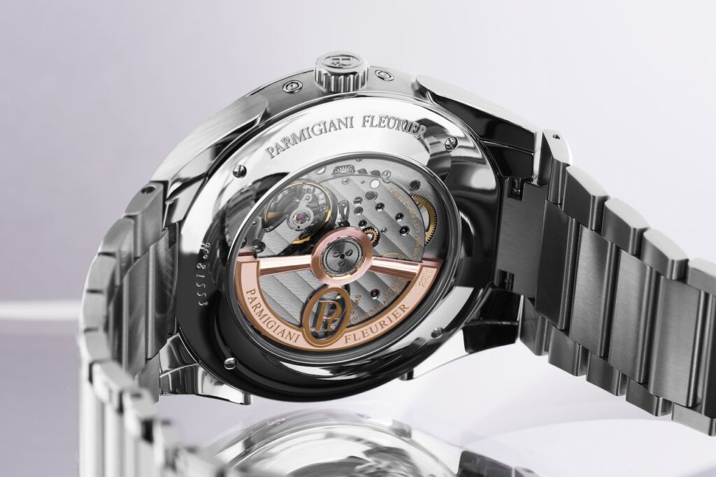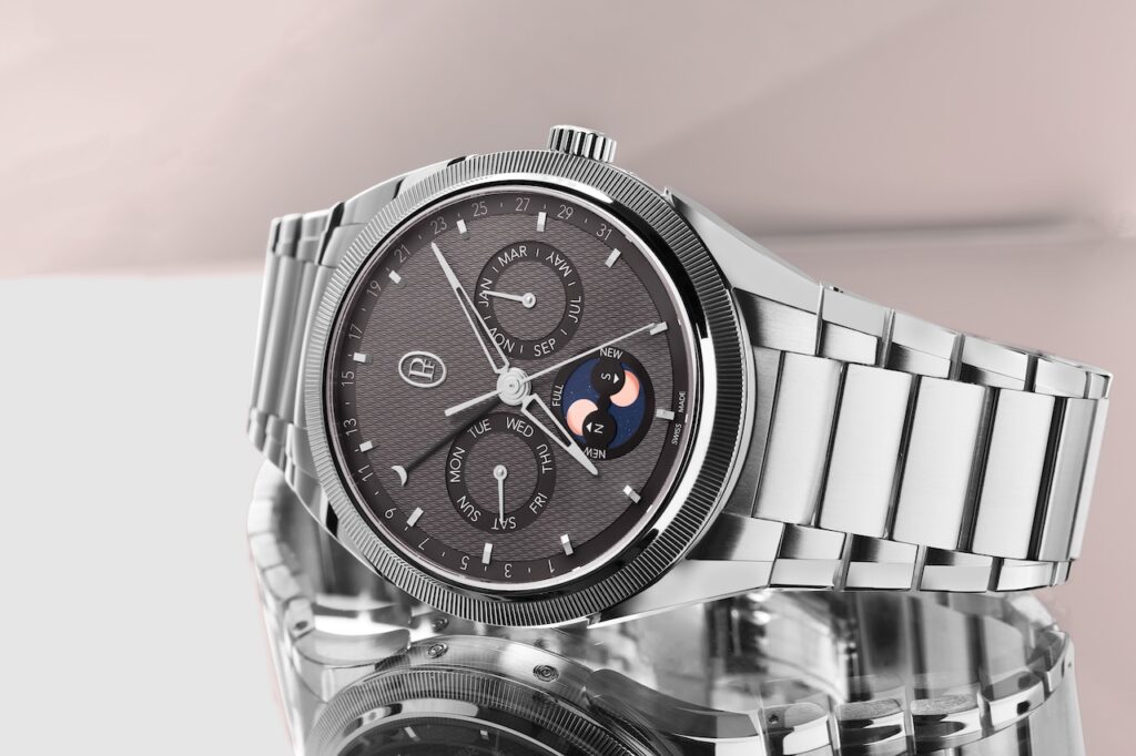 2021年推出的Parmigiani Fleurier Tonda PF年曆錶款,將複雜的曆法功能融入簡練的運動優雅設計中。腕錶搭載品牌自製的PF339自動機芯,在品牌標誌性的「格狀大麥粒」手工機刻雕紋錶盤上,最獨特之處在於外圈的逆跳日期顯示,月亮指針在月底會瞬間跳回起點,既具動態美感又不遮擋六點鐘位置精緻的南北半球精確月相,這個月相每122年才需手動校正一次。左右兩邊的小錶盤,分別指示星期及月份,錶盤上各項顯示一目了然,平衝了功能與時尚的設計要求,是當代年曆腕錶的模範傑作。