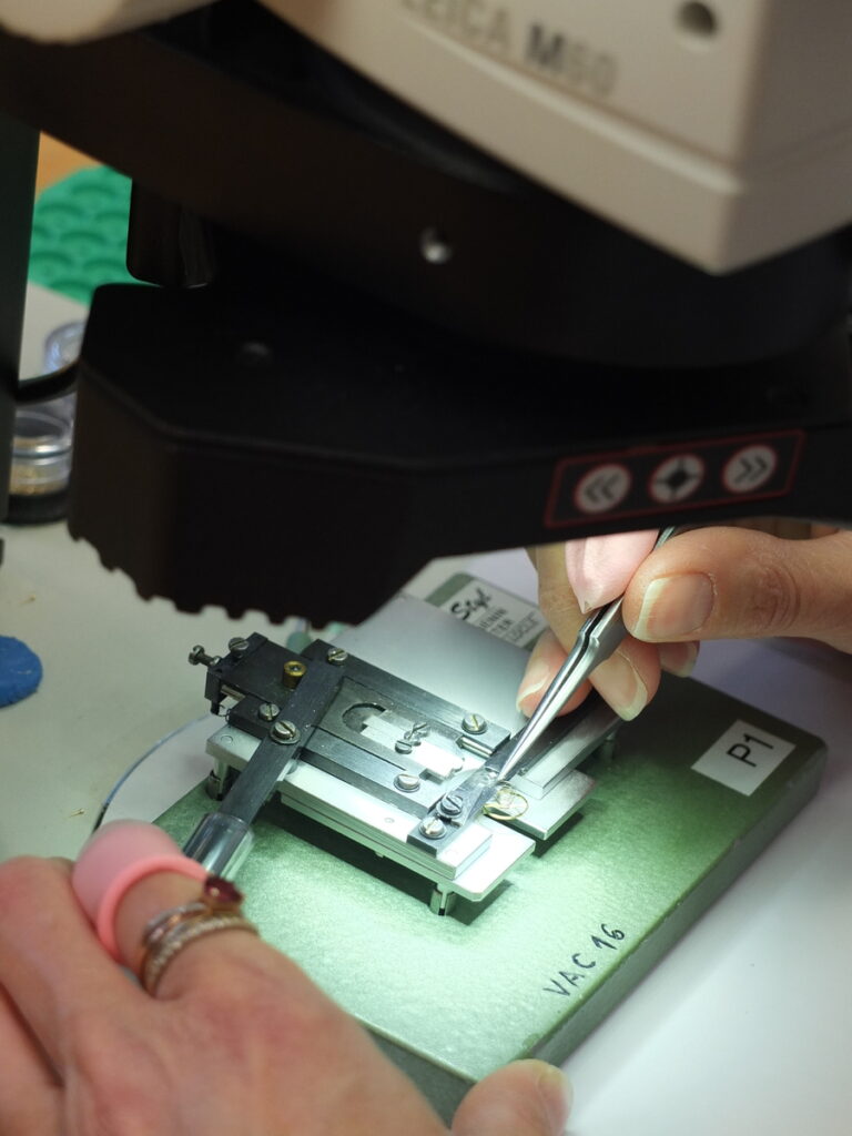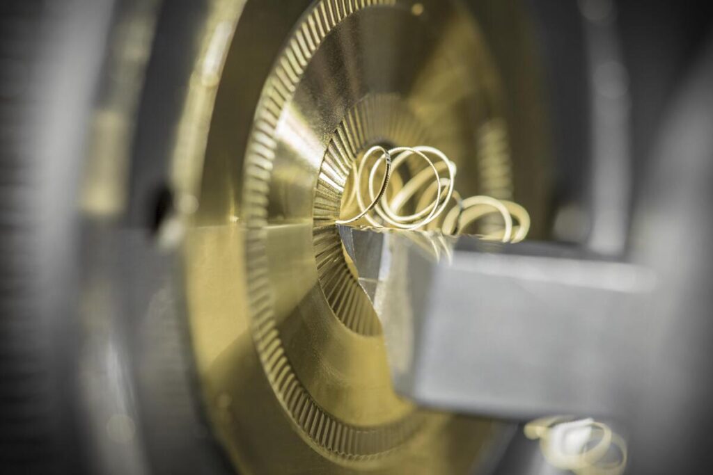之後我們去到擺輪游絲製作室這塊「禁地」,大家都知道沒有多少品牌有能力自行生產擺輪游絲,江詩丹頓就是少有的其中之一。原材料是高度機密,製作過程也是重要的才產,不過江詩丹頓就大方地讓我們參觀和拍照。簡單地說,金屬線原材料經過多重精密的工序被拉成更纖幼的金屬絲,再壓扁和拉成游絲,再用特殊工具把四條游絲同時捲成螺旋狀,然後經過數次烘烤使螺旋狀游絲定型,再把它們分離,最後送到另一個工作室,裝上擺輪並進行調校,再以人工屈曲游絲終端曲線的弧度,這就是一台機芯心臟的誕生了。除了擺輪和游絲之外,江詩丹頓亦會自行生產其他擒縱裝置的零件,包括擒縱輪和擒縱叉,就連擒縱叉上的人工寶石,也是以人手組裝上去的,然後再以先進光學儀器檢查。