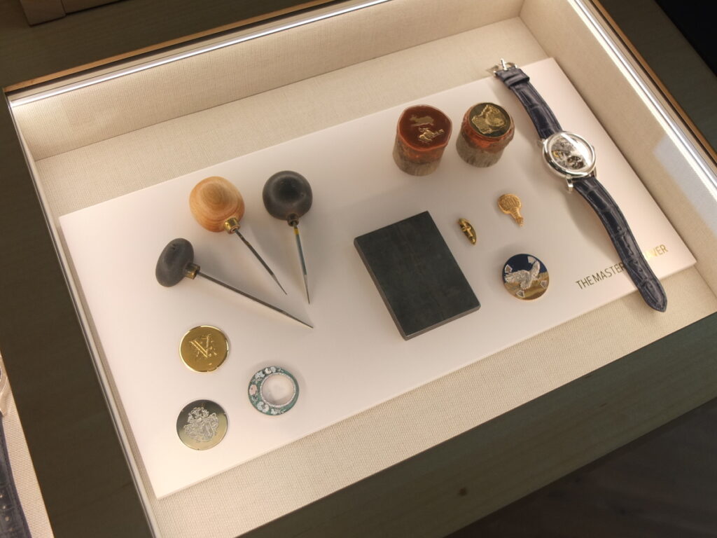 行程的最後一站,就是參觀江詩丹頓的Métiers d’Art藝術工藝部門,這裏可謂臥虎藏龍,每位工匠均身懷絕技,他們都會按照設計好的草圖,把圖像移植至細小的錶盤上,可謂鬼斧神工。有時這些工匠也會挑戰自我,轉戰其他工藝,例如有一位曾經來港獻技的女雕刻大師,從16歲開始便學習和製作雕刻作品,至今超過20年,但今次參觀錶廠,就看到她在做微繪琺瑯工藝,可謂周身刀,張張利。當中還有一件有趣事情與大家分享,有位琺瑯大師跟我們說,她的畫筆筆頭是用自己種的仙人掌上的刺來造的。原來無論是製錶師、雕刻大師、琺瑯大師,他們都會自己打造自己的工具。之後就是寶石鑲嵌,我們正好看到大師在為錶殼鑲上長方形切割鑽石。再來就是guilloché機刻,有些品牌會先做好一個機刻花紋的模具,然後把花紋壓印在錶盤上,其實嚴格來說那不可以叫作guilloché。當然,江詩丹頓的guilloché是如假包換的機刻花紋,他們擁有三台二十世紀初製造的機刻車床,其中一部是1900年的產物,到現在還在使用。