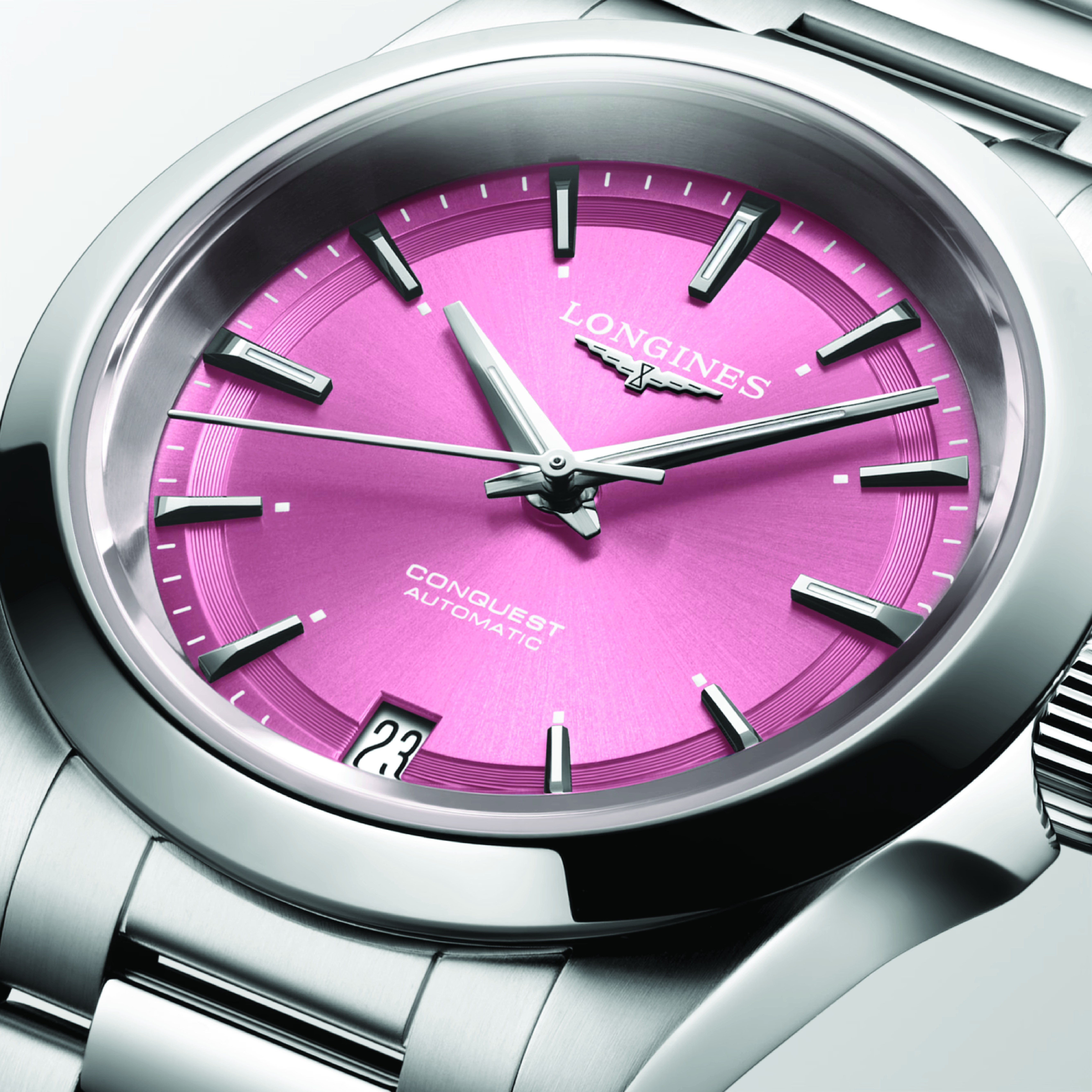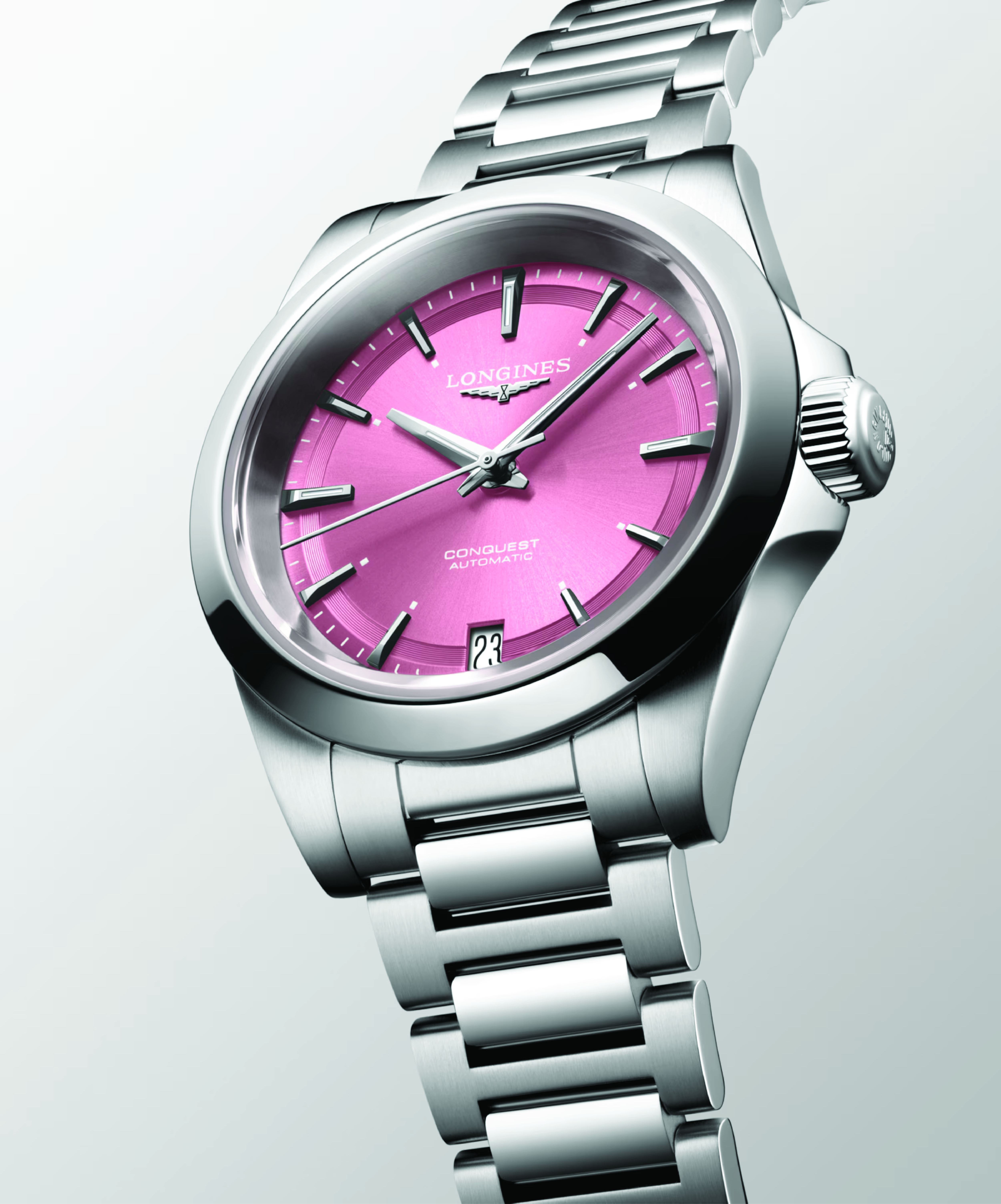 兩年前,Longines為經典的日常錶款Conquest系列注入了前所未有的青春氣息,其中包括這款34毫米的粉紅女裝新錶,面盤採用了現代感強烈,有如草莓奶昔的粉色,配上簡約的太陽放射紋效果,令色彩在不同角度下閃爍著活力。精鋼腕錶兼具100 米防水性能與俐落的正裝外型,更可與38毫米或41毫米的Conquest系列腕錶配成一對。34毫米尺寸雖小,均與其他Conquest系列自動腕錶一樣搭載L888自動機芯,配備單晶矽擺輪游絲及防磁功能,動儲72小時。