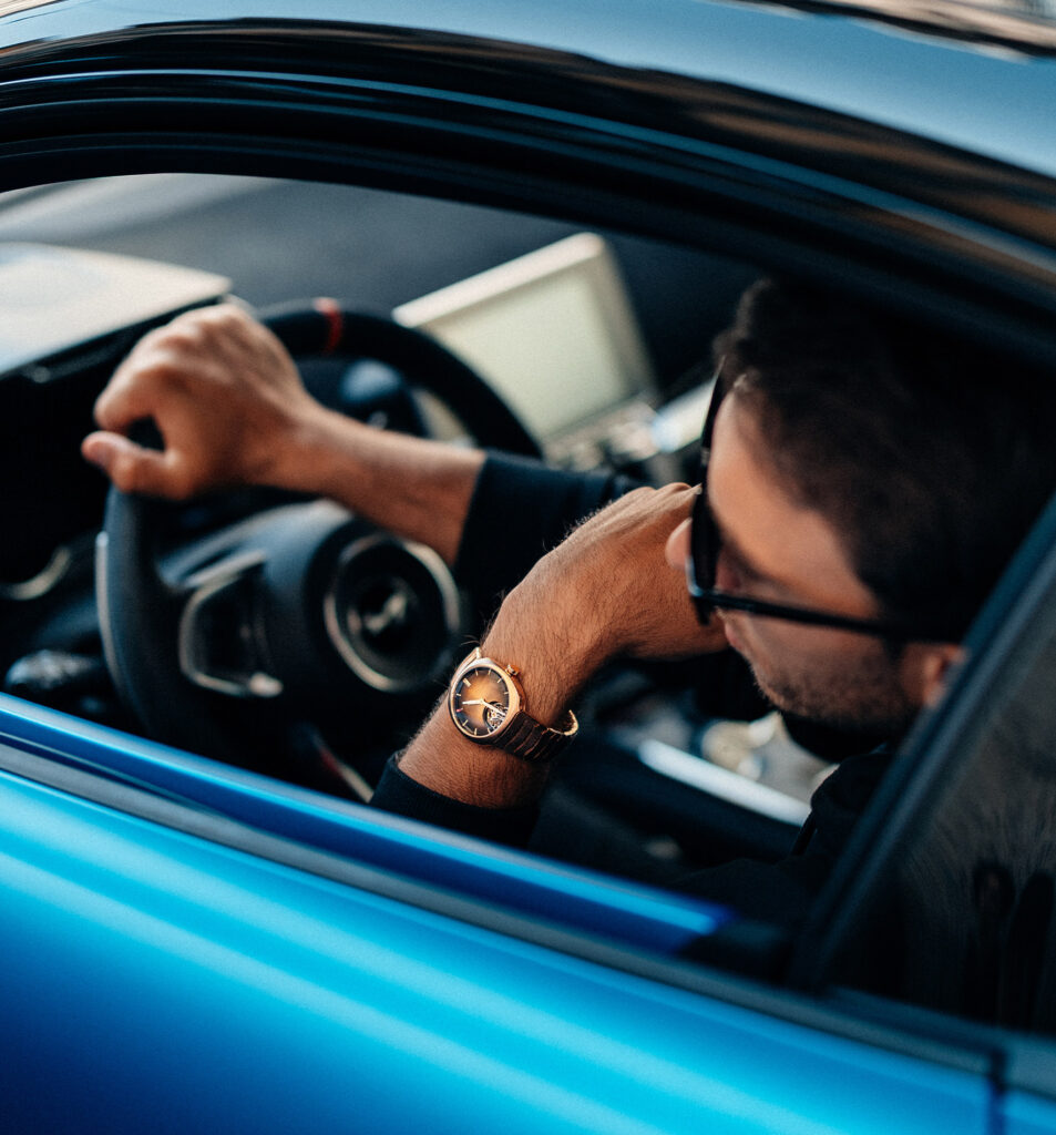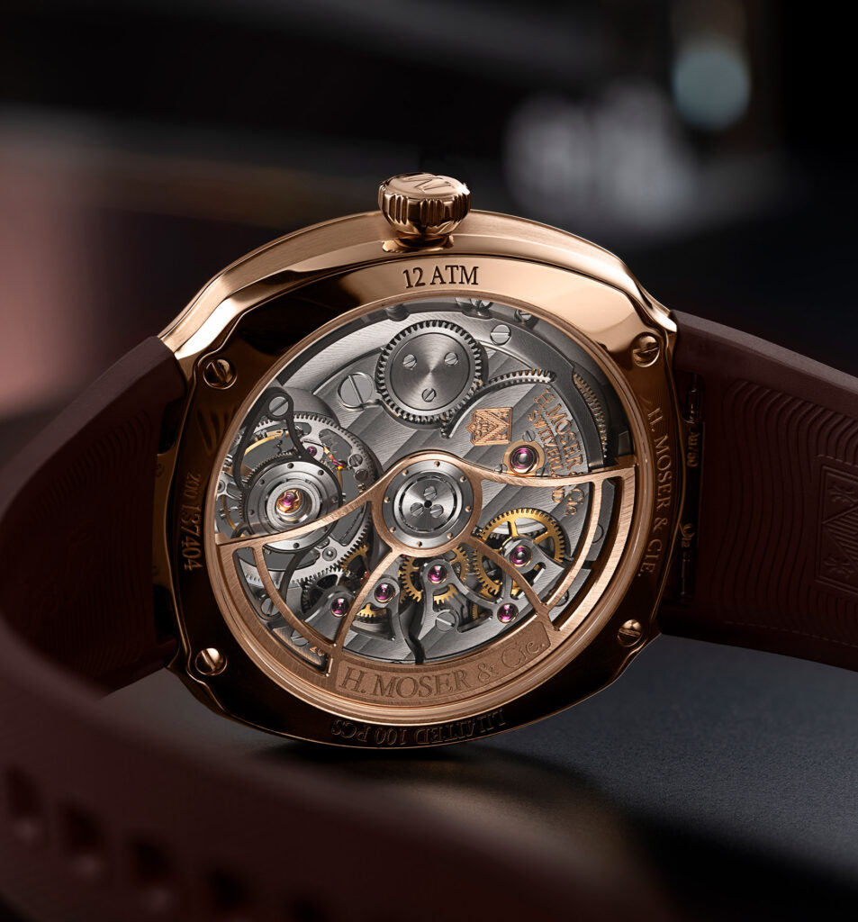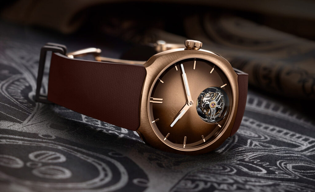 這款由H. Moser & Cie.與F1賽車手Pierre Gasly聯名打造的Streamliner陀飛輪腕錶,錶盤上那抹由Gasly親自命名為Chocolate fumé的朱古力煙薰色澤,隨著光影流轉,散發出從濃郁純黑到絲滑焦糖的漸變層次,在5N紅金錶殼的映襯下,展現出溫潤與奢華格調。6點鐘位置的一分鐘飛行陀飛輪,在朱古力煙薰的背景中規律運轉。腕錶搭載結合了雙層游絲技術的HMC 805自動機芯,橡膠錶帶版本與全金版本各限量100枚及10枚。