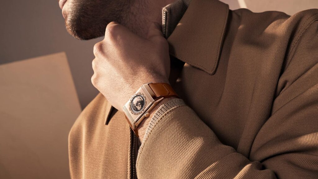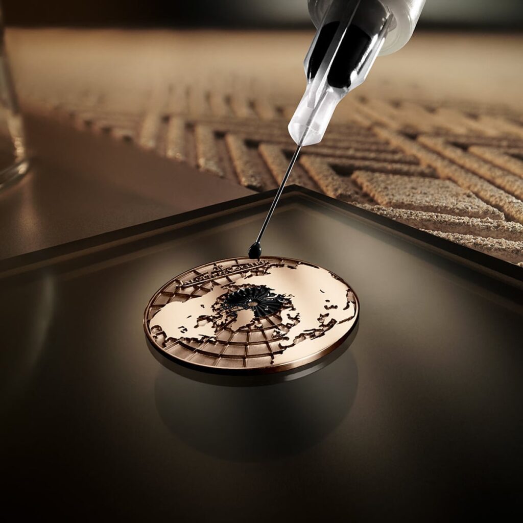 Reverso誕生於守護初心,翻轉後的留白背部常鐫刻私密愛語。它對外抵禦碰撞,對內珍藏深情,是將愛情誓約收納於心間的浪漫時計。至於這款限量150枚的Reverso Tribute Geographic翻轉系列腕錶,無疑是一封寫給環球旅人的情書:18K玫瑰金結合朱古力色放射紋錶盤,正面設計簡潔優雅,翻轉後則見細膩的金質大陸輪廓與漆面海洋,搭載積家自製834型手上鍊機芯,透過單一按鍵即可掌握全球時區。