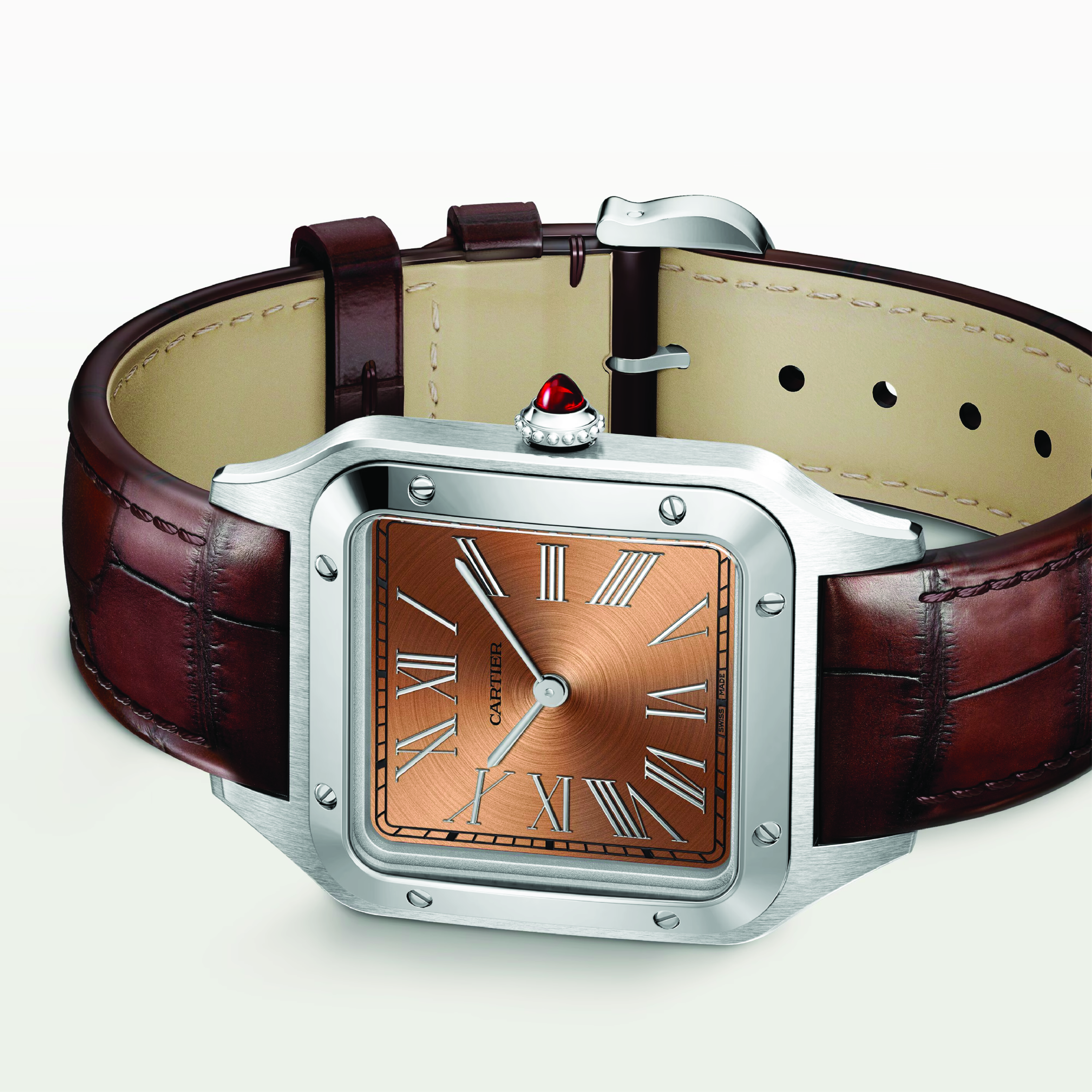 這款Santos-Dumont 鉑金超大型款腕錶(46.6 X 33.9毫米)起源於 1904 年Louis Cartier與飛行先驅Alberto Santos Dumont之間的真摯友誼,是世界首枚腕錶的經典續篇。色澤有如拖肥朱古力的銅質錶盤與紅寶石錶冠等細節,加上配襯棕色鱷魚皮錶帶,散發出如朱古力般濃郁的復古韻味,卻不失今日時尚的俐落感覺。腕錶搭載Cartier 430MC型手上鍊機芯,錶背鐫刻Alberto Santos Dumont的親筆簽名,見證了跨越世紀的先驅精神,更承載著一段深厚的友誼。