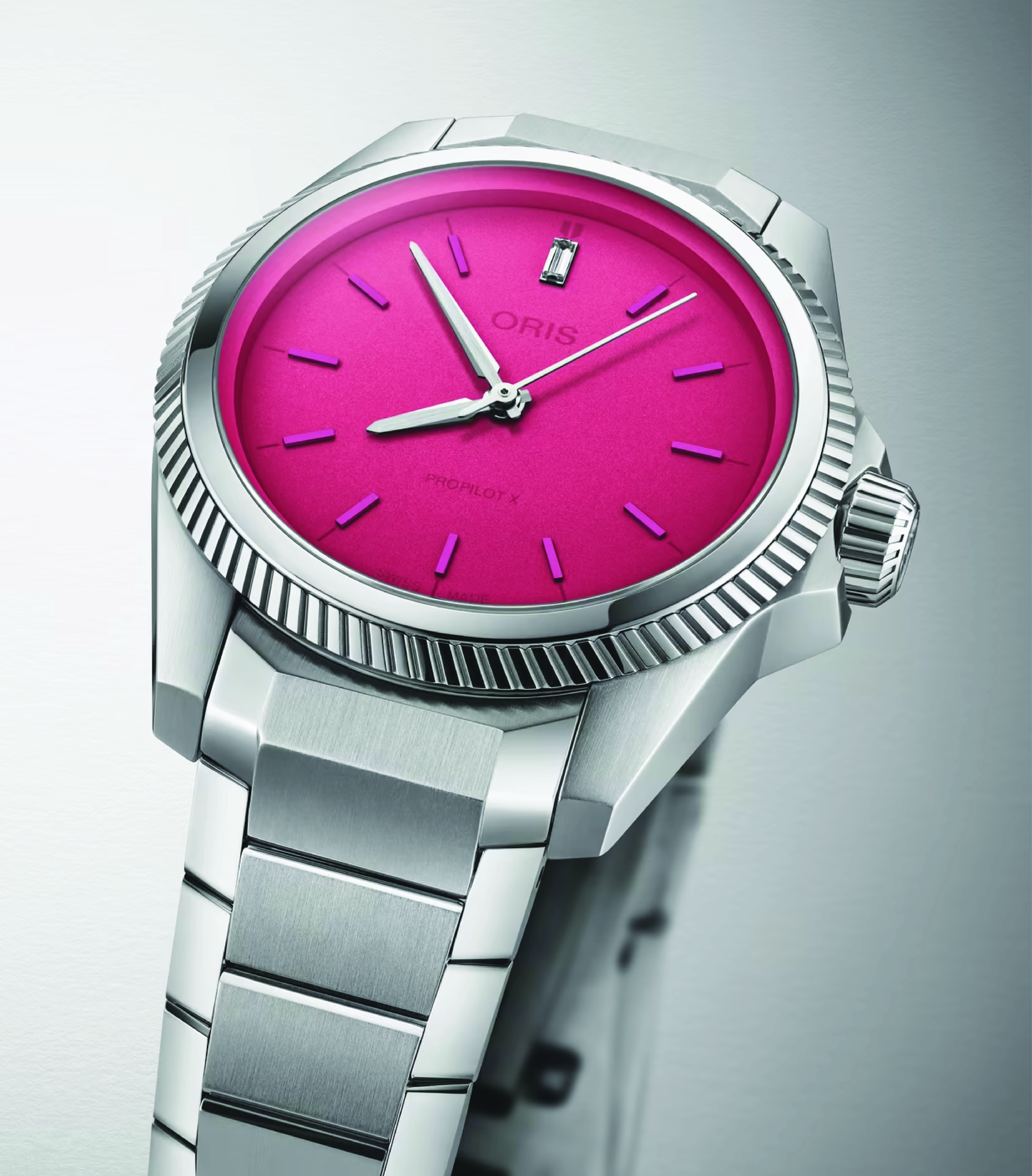 這枚去年一月推出的聯乘錶款,是三年前Oris ProPilot X Kermit the Frog「科米蛙錶」的後續,今次主角是《The Muppet Show》中最耀眼的Miss Piggy,兩大傳奇布公仔終於在Oris ProPilot X系列錶款成雙成對,so sweet!34毫米精鋼錶殼配搭螢光粉紅面盤,12點的鑽石時標,象徵豬小姐的貴氣,想見豬小姐?隨著擺陀轉動,豬小姐會從密封底蓋的小圓窗中若隱若現,有緣就會遇見。