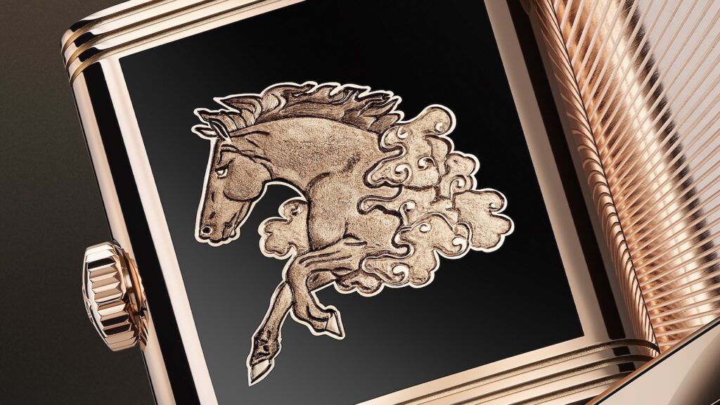 積家特別為馬年打造Reverso Tribute Enamel Horse馬年特別版腕錶,將Reverso經典翻轉錶殼轉化為琺瑯藝術的畫布。腕錶採用玫瑰金錶殼,比例修長輕薄,佩戴舒適不壓手。正面黑色大明火琺瑯錶盤,質感深邃細膩,配刻面鑲貼時標、軌道式分鐘刻度及太子妃式指針;翻轉錶背才是真正驚喜,同樣以黑色琺瑯為基底,與閃亮馬身相互映襯,馬鬃、肌肉紋理、馬蹄等細膩細節則以黑色銠金屬手工描繪,栩栩如生、層次分明,而雲朵的噴砂質感更增添靈動視覺效果。每匹駿馬皆由積家鐫刻大師耗費80小時手工完成;搭載經典822手上鍊機芯,提供時、分顯示,動力儲存約42小時,襯黑色鱷魚皮錶帶,限量10枚。