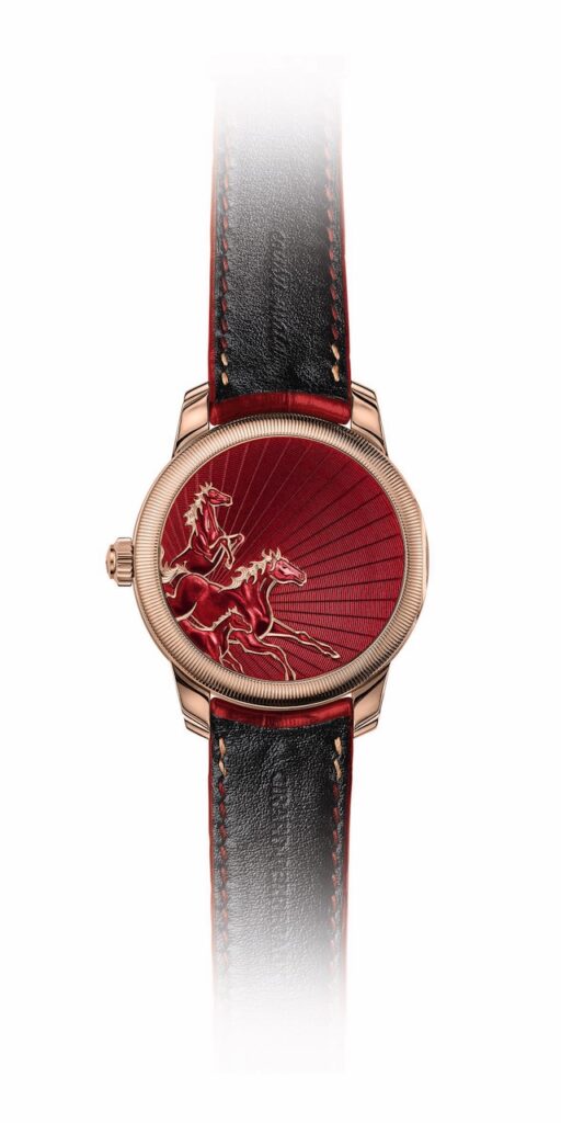 江詩丹頓自2012年起,每年例行推出Métiers d’Art藝術大師系列中國十二生肖傳奇限量腕錶,率先引領生肖錶熱潮。延續第二輪12年創作循環,Métiers d’Art藝術大師系列The Legend of the Chinese Zodiac中國十二生肖傳奇之馬年腕錶,共有兩款傑作:18K 5N粉紅金與950鉑金,各限量25枚。採用直徑40毫米錶殼,四個圓形視窗巧設錶盤外緣,10點位置顯示小時、2點位置顯示分鐘、4點位置顯示日期、8點位置顯示星期,騰出中央呈現大明火琺瑯微縮繪畫與浮凸雕刻傑作,駿馬躍然其上,馬鬃肌理細膩動感,背景漸染宛如黎明天光,層層雲霧與山巒交織,展現馬年磅礡生命張力與優美姿態。粉紅金款襯溫潤棕色鱷魚皮錶帶,而鉑金款則襯深藍鱷魚皮,兩者均彰顯低調奢華。腕錶搭載2460 G4自動機芯,提供約40小時動力儲存,可從透明藍寶石底蓋欣賞到22K黃金馬耳他十字鏤空擺陀,以及日內瓦波紋、手工倒角、鏡面拋光等精緻裝飾。
