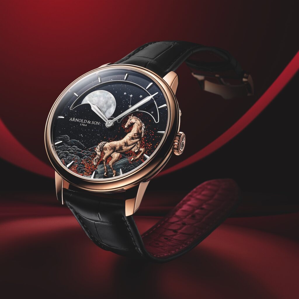 Arnold & Son為慶祝2026丙午火馬年推出Perpetual Moon 41.5 Red Gold「Year of the Horse」限量腕錶,直徑41.5毫米玫瑰金錶殼內,黑色砂金石錶盤微繪山巒林木,中央18K紅金手工立體雕刻駿馬躍然紙上,肌肉紋理和飛揚的鬃毛栩栩如生,手工繪製的金色微塵如火光般綻散,隨其步履依序點亮,在昏暗環境下,覆有Super-LumiNova夜光的星塵會發出紅黃火焰效果,視覺層次極豐富。珍珠母貝月亮配手繪仙后座與大熊座夜光星圖,而錶背亦設有第二月相顯示,可快速而精準地調整月相。由A&S1512手上鍊機芯驅動,雙發條盒提供約90小時動力儲存,防水30米,限量8枚,售價約$553,000。