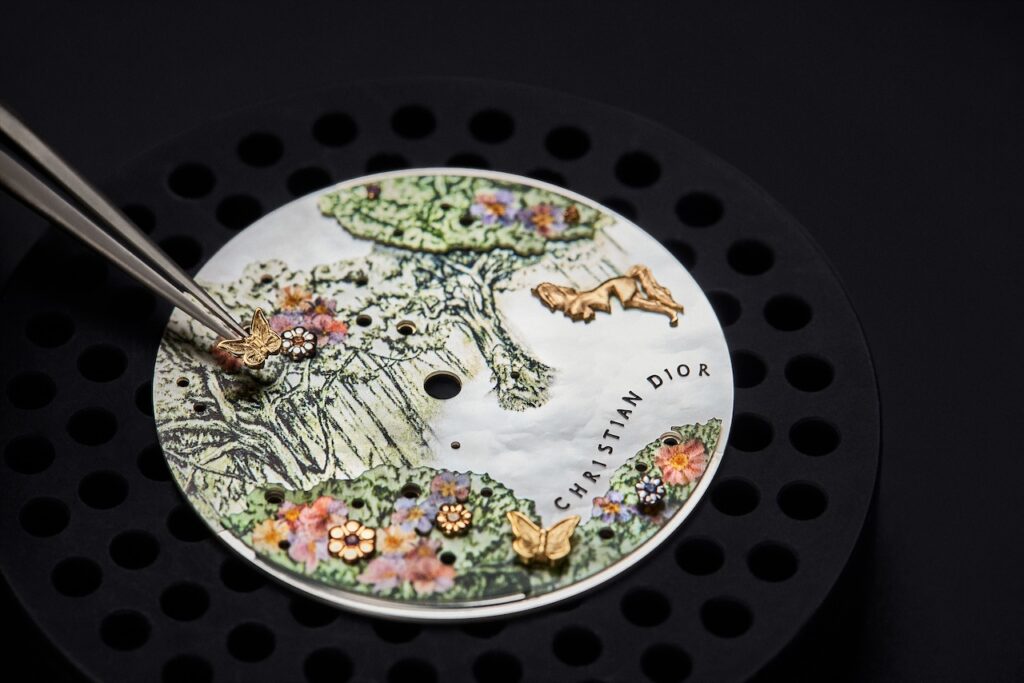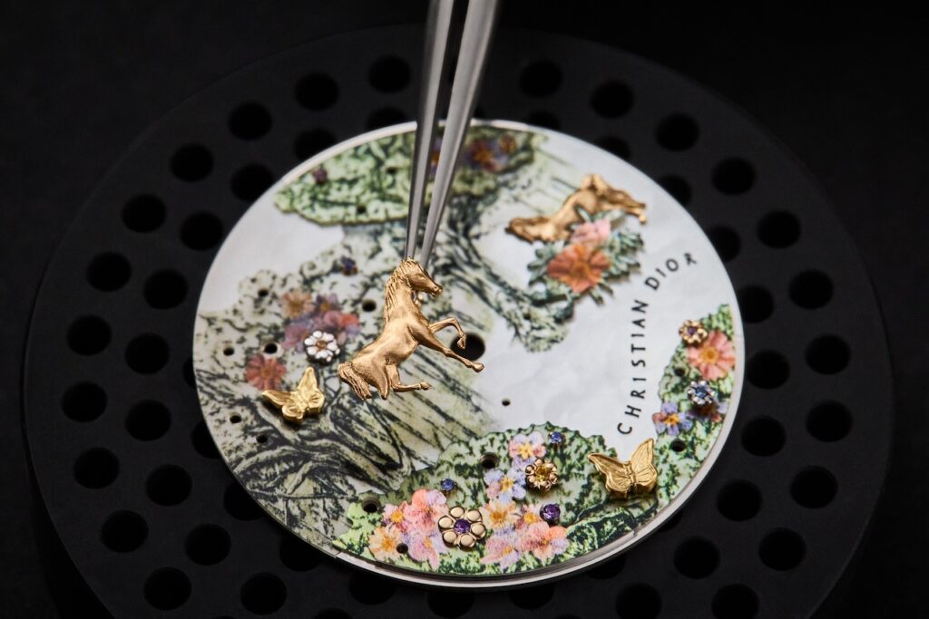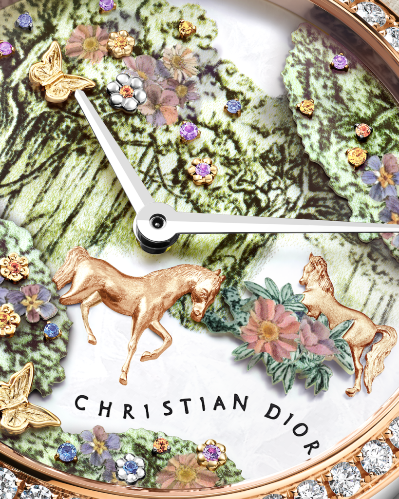 Dior Grand Soir馬年腕錶以法國經典Toile de Jouy印花圖騰為靈感,巧妙呈現一片綠意盎然、枝葉繁茂的夢幻森林景象,如今被Dior注入生肖元素,化作2026馬年限量傑作,完美融合東西方審美精髓。採用直徑36毫米精鋼錶殼,玫瑰金錶圈上鑲有52顆璀璨鑽石,折射出萬千光芒,增添高貴氣韻。層層疊疊的綠葉在珍珠貝母錶盤上延伸,枝椏間繁花盛開,片片粉金雕刻花朵精緻玲瓏,這些花瓣不僅是裝飾,更鑲嵌上紫水晶、錳鋁榴石、黃藍剛玉,伴隨粉金蝴蝶翩翩飛舞。兩匹金色駿馬自由自在地穿插森林中,營造自然和諧共生的詩意畫面。搭載Sellita SW300自動機芯,提供約42小時動力儲存,襯米色緞面皮錶帶,限量30枚。
