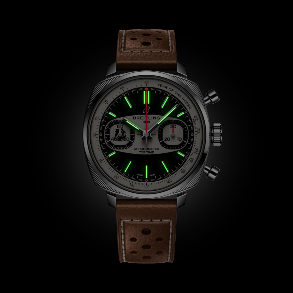 Breitling為馬年推出Top Time B01計時腕錶赤影黑騎限量版(Shadow Rider),這款馬年生肖特別作融合60年代復古設計和現代工藝,致敬自由不羈、速度與精準的先鋒精神,馬象徵自由與爆發力,其優雅姿態與Top Time系列精神契合。直俓38毫米精鋼枕形錶殼配微凸藍寶石玻璃,回歸復古尺寸,錶盤中央飾有呈橢圓形、源自歷史檔案的特色「儀錶盤」圖案;兩個計時小錶盤採用獨特方圓形設計,9點位置的小秒盤內嵌黑騎側影,姿態靈動,而3點位置的30分鐘計時盤和秒針均綴有紅色,熱情醒目。測速刻度環上12點到2點位置寫有「YEAR OF THE HORSE」字樣,而錶背鐫刻「ONE OF 288」限量數目及黑騎圖騰。腕錶搭載B01自動機芯,經COSC瑞士官方天文台認證,提供約70小時動力儲存,襯米色穿孔小牛皮錶帶,限量288枚,售價約$53,800。