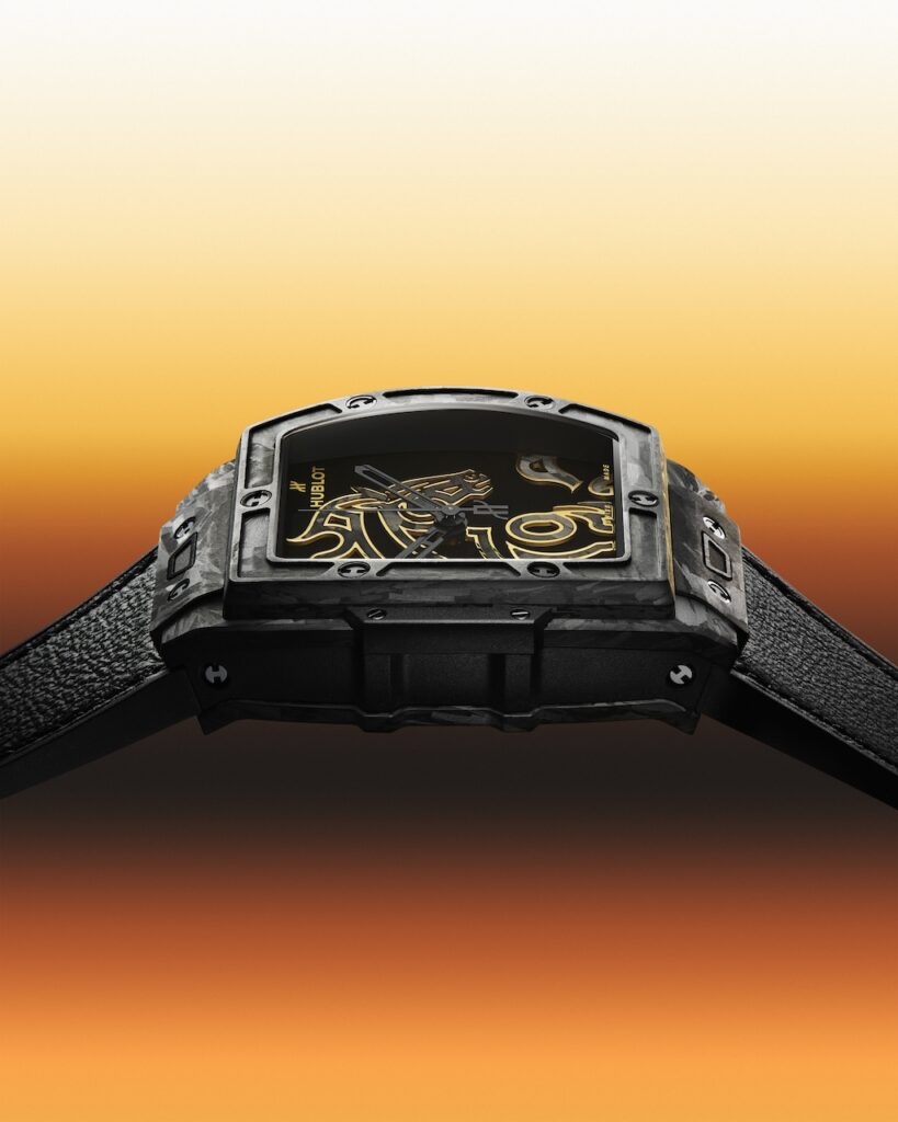 馬年將至,Hublot以一匹「躍動黑馬」打開2026年新篇章,Spirit of Big Bang丙午馬年腕錶的42毫米酒桶形錶殼以霧面黑色碳纖維打造,六顆「H」形螺絲凸顯運動基因,黑色漆面錶盤中央採用碳纖維細工鑲嵌工藝與鍍3N金黃銅鑲貼,勾勒奔騰駿馬輪廓,再以鍍金線條細膩描繪鬃毛與肌肉紋理,靈感源自唐代壁畫中珍貴的「五花馬」(頸部鬃毛修剪成五瓣花形的極品戰馬),呈現立體層次和東方氣韻。從煙燻藍寶石底蓋透視HUB1710自動機芯,提供約50小時動力儲存和100米防水性能,襯黑色小牛皮內襯橡膠錶帶搭配One Click快拆系統,佩戴輕盈舒適。屬大中華區特別版腕錶,限量88枚,售價約$280,700,專為欣賞材質工藝與生肖美學的藏家打造。