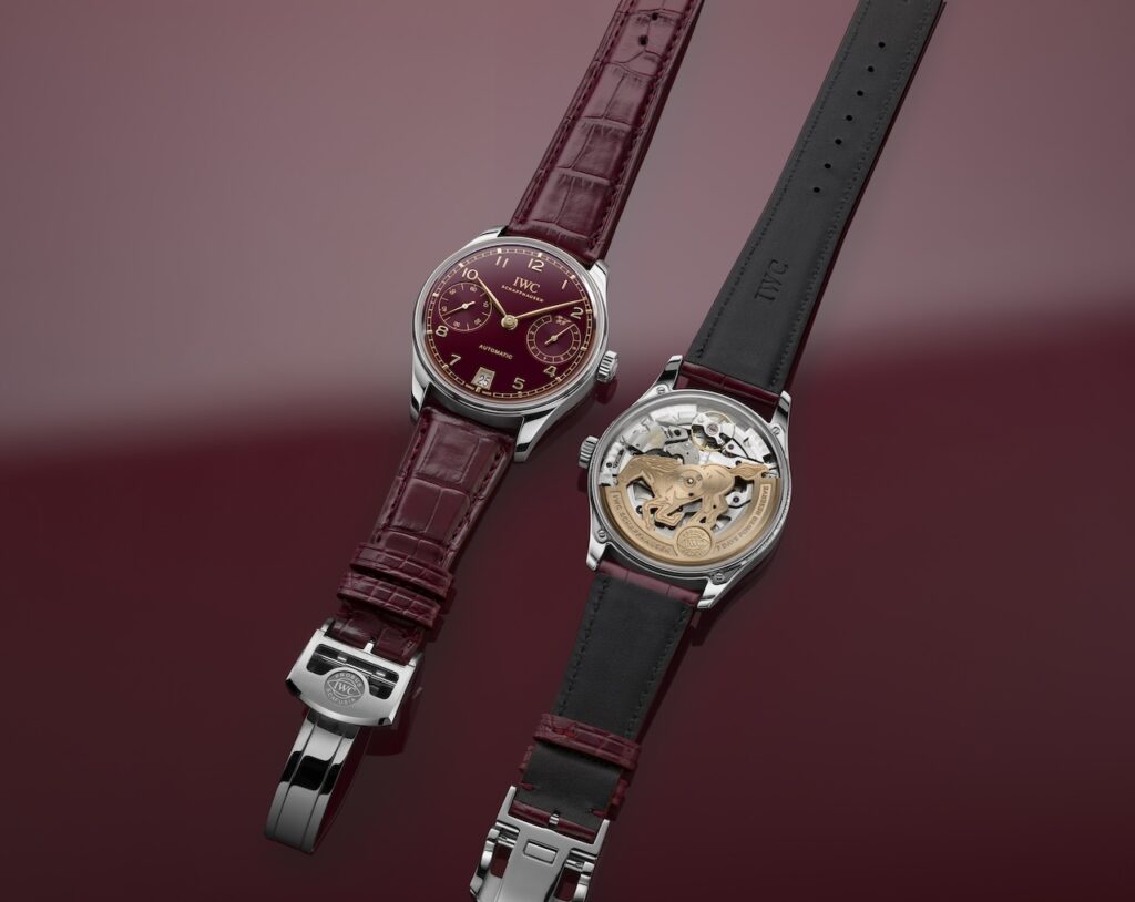 IWC萬國錶延續每年推出農曆新年特別版時計的傳統,以葡萄牙系列自動腕錶42馬年特別版承載祝福與新年期盼。馬年特別版(型號 IW501709)限量500枚,採用直徑42毫米精鋼錶殼,正反兩面均配備箱型藍寶石水晶玻璃;深邃的酒紅色錶盤取材自農曆新年象徵喜慶與吉祥的紅色調,搭配鍍金指針和時標,營造華麗而不張揚的優雅格調。從藍寶石透明底蓋可以欣賞到IWC自製52011機芯,配備高效能比勒頓自動上鍊系統,零件以幾乎不會磨損的陶瓷製成,雙發條鼓提供長達168小時的動力儲備,而鍍金擺陀更特意設計成駿馬奔馳的圖案,襯經典黑色和酒紅色鱷魚皮錶帶,售價約$117,000。