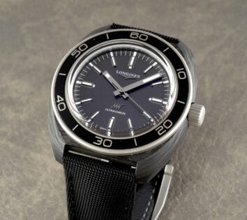 這款腕錶是品牌首次應用了碳纖維材質的錶款,錶殼直徑達43毫米,延續了經典的枕形設計,並經過高溫加熱和高壓壓縮而成,展現出隨機的碳纖維紋理,每一枚錶殼都變得獨一無二。整枚腕錶連錶帶在內也不到80克,固定的鈦金屬錶圈嵌入了鋁製襯墊,刻有以10為單位的時間刻度。錶背和旋入式錶冠同樣由鈦金屬製成。碳黑色的錶盤上鑲有12個鍍銀時標,與灰色PVD塗層的時分針一樣,均塗有Super-LumiNova夜光塗層。搭載ETA為Longines獨家提供的L836.6高振頻自動機芯,5 Hz擺頻,動力儲存約52小時,並配備矽游絲,增強了防磁性能。一枚Ultra-Chron Carbon 腕錶均獲得日內瓦獨立測試實驗室TIMELAB的認證。防水深度300米,搭配黑色織物錶帶、鈦金屬針扣。售價約$39,800。 (Text & Photo: 楊文翰)