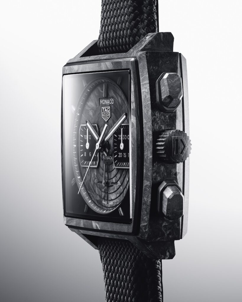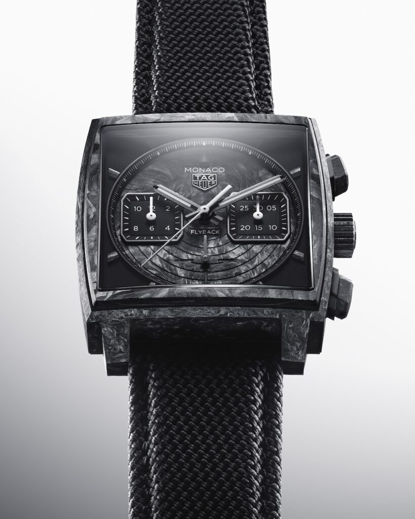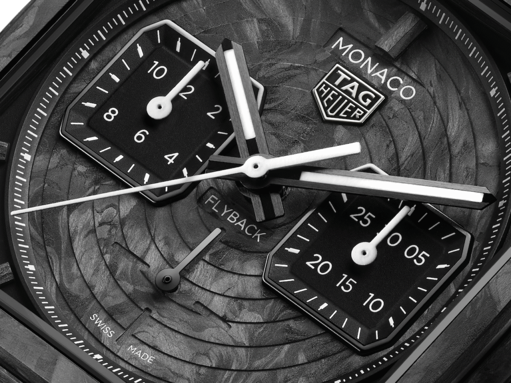 其中,Monaco Flyback Chronograph TH-Carbonspring,方形經典錶殼以39毫米黑色鍛造碳纖維,配相同材質的錶冠與按鈕,以及藍寶石水晶鏡面和底蓋,防水100米,堅韌到能扛住日常碰撞。錶盤用碳纖維打造,螺旋紋路呼應碳游絲,黑色凸緣配60秒刻度,三個小盤於3、6、9點鐘位置排列整齊,其中分鐘和小時計時盤用黑色蛋白石,時標和指針黑金色配Super-LumiNova夜光塗層;唯獨6 點鐘位置的小秒盤則用上黑金色指針;中央飛返秒針白亮醒目。
